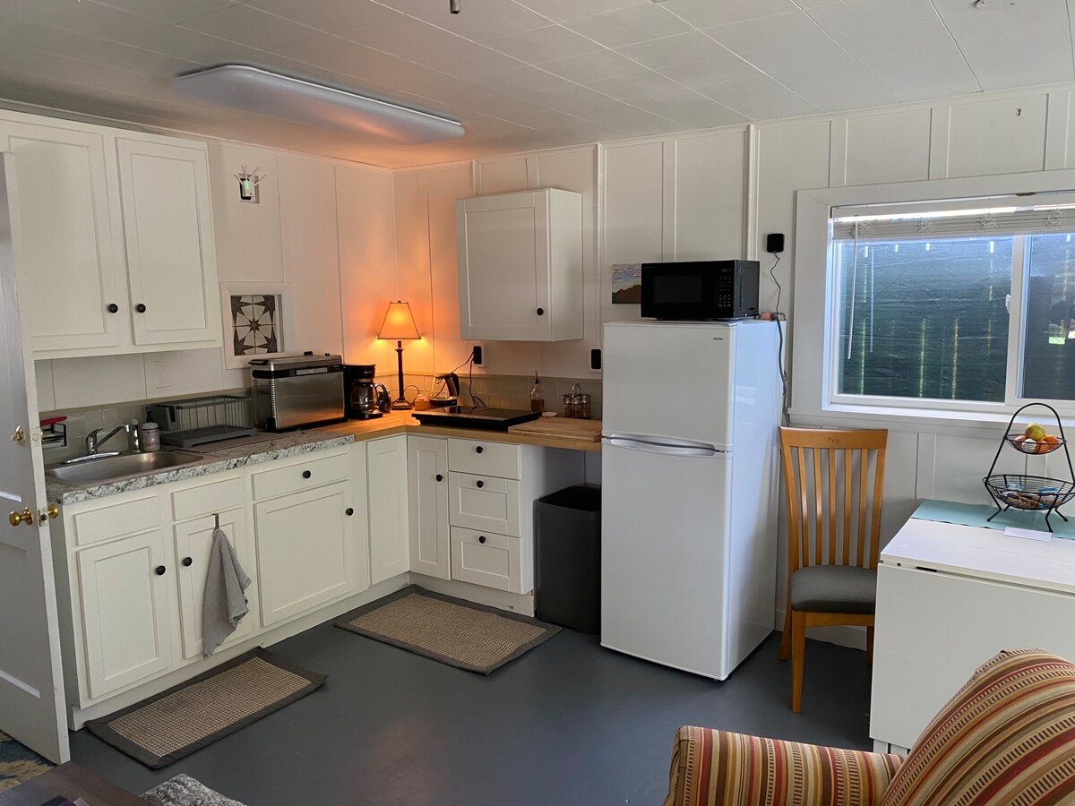 A studio carriage house complete with living room, bedroom space, kitchen and bathroom. Kitchen includes a double burner invection cooktop, ninja oven, coffee maker, microwave and full-size fridge. Dishes and cooking basics also provided. Tv includes Netflix, Prime, Disney+, and Hulu. Wi-Fi is strong and makes for a good work from home setting.
