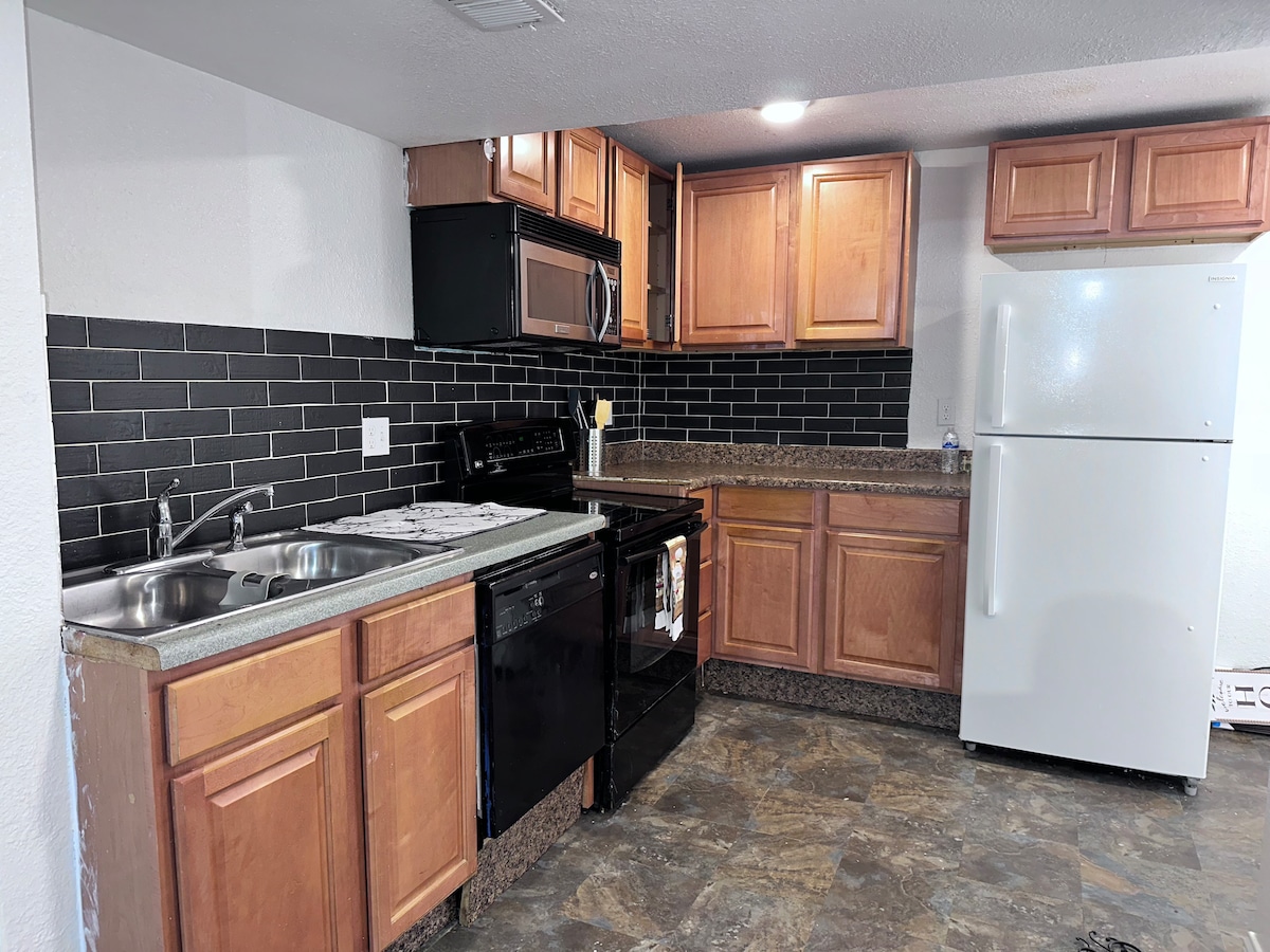 Kitchen with refrigerator, stove/oven, microwave, toaster, and Keurig coffee station with coffee, tea, and hot chocolate. The kitchen is stocked with essentials for cooking.