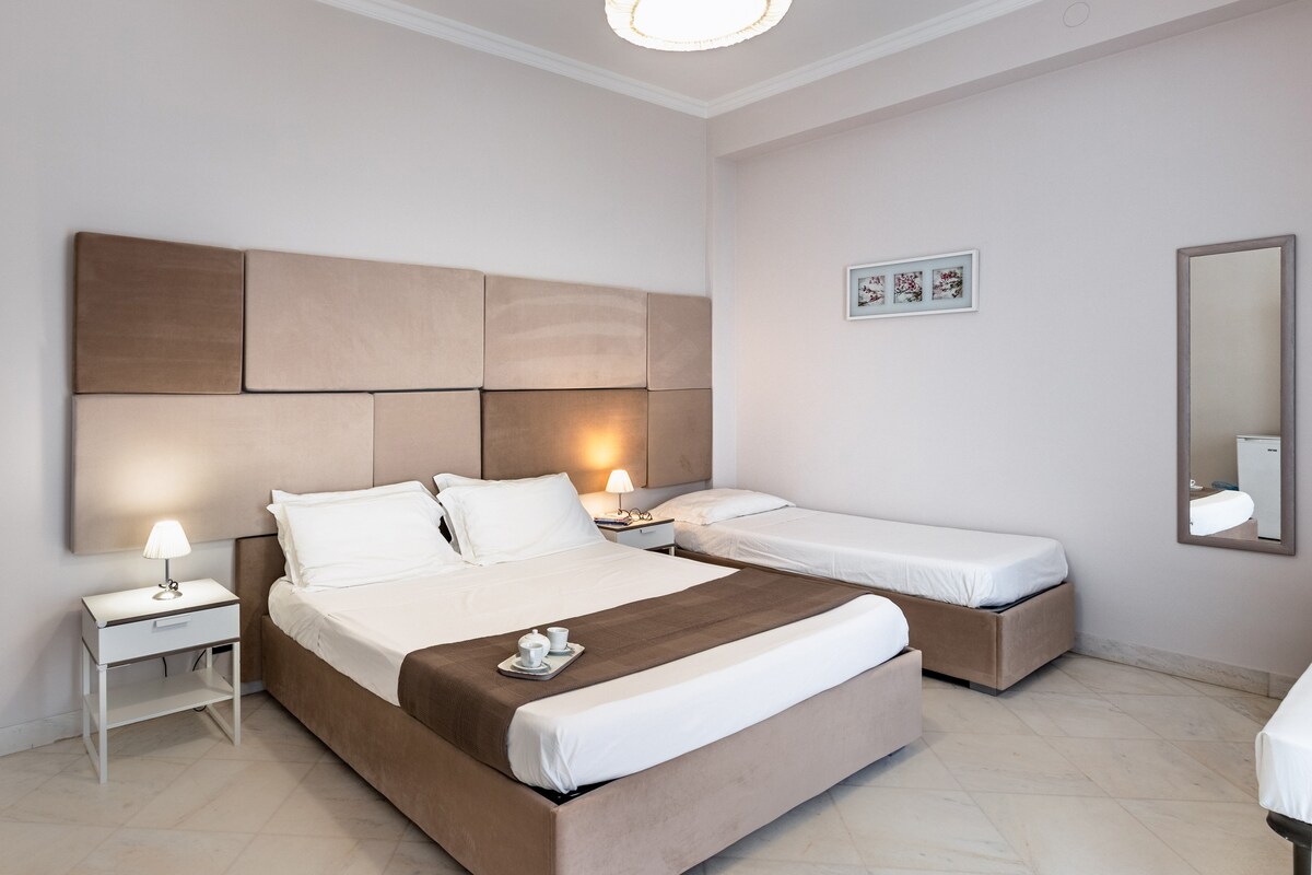 New and elegant quadruple room with balcony and private bathroom in the room, equipped with flat screen TV, desk, minibar, heating and air conditioning.