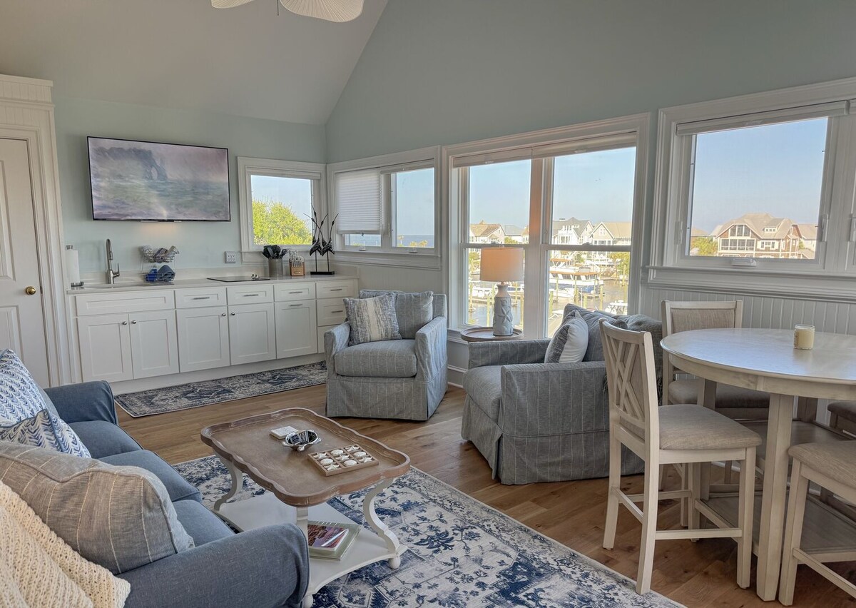 The second floor Cape Fear suite is the one of the “crown jewels” of The Marsh Harbour. A Living Room/Dining Room combination features a fully stocked kitchen with granite countertops, full-size refrigerator, microwave, stove top, toaster oven, drip and Keurig coffee makers, large stainless-steel sink, dimmable pendant lighting and more. Find that blender stored under the counter and whip up your favorite frozen concoctions – you're on Island time! This captivating suite is beautifully decorated with custom furnishings, a large wall mounted Smart TV with cable and a DVD player. High speed internet is included for your streaming and browsing pleasure. The comfy sectional sofa has a twin pullout ensuring complete comfort for an extra adventure weary sleeper. The master bedroom includes a king-sized bed, ample space for your vacation attire and a full bath. No detail has been overlooked. A delightful distinction of the Cape Fear Suite is its private 30-foot covered porch with dining and rocking chairs overlooking the marina. French doors from the bedroom and the living room open to a perfect setting to take in our famous Bald Head Island sunsets or just rock away watching the activity on the Harbor, River, and the Ocean Beyond. The views from this suite are simply amazing from every space. Restaurants, bars, West Beach, and Old Baldy are just a scenic stroll away. A 4-person golf cart is available for your Island Adventures at no additional cost.