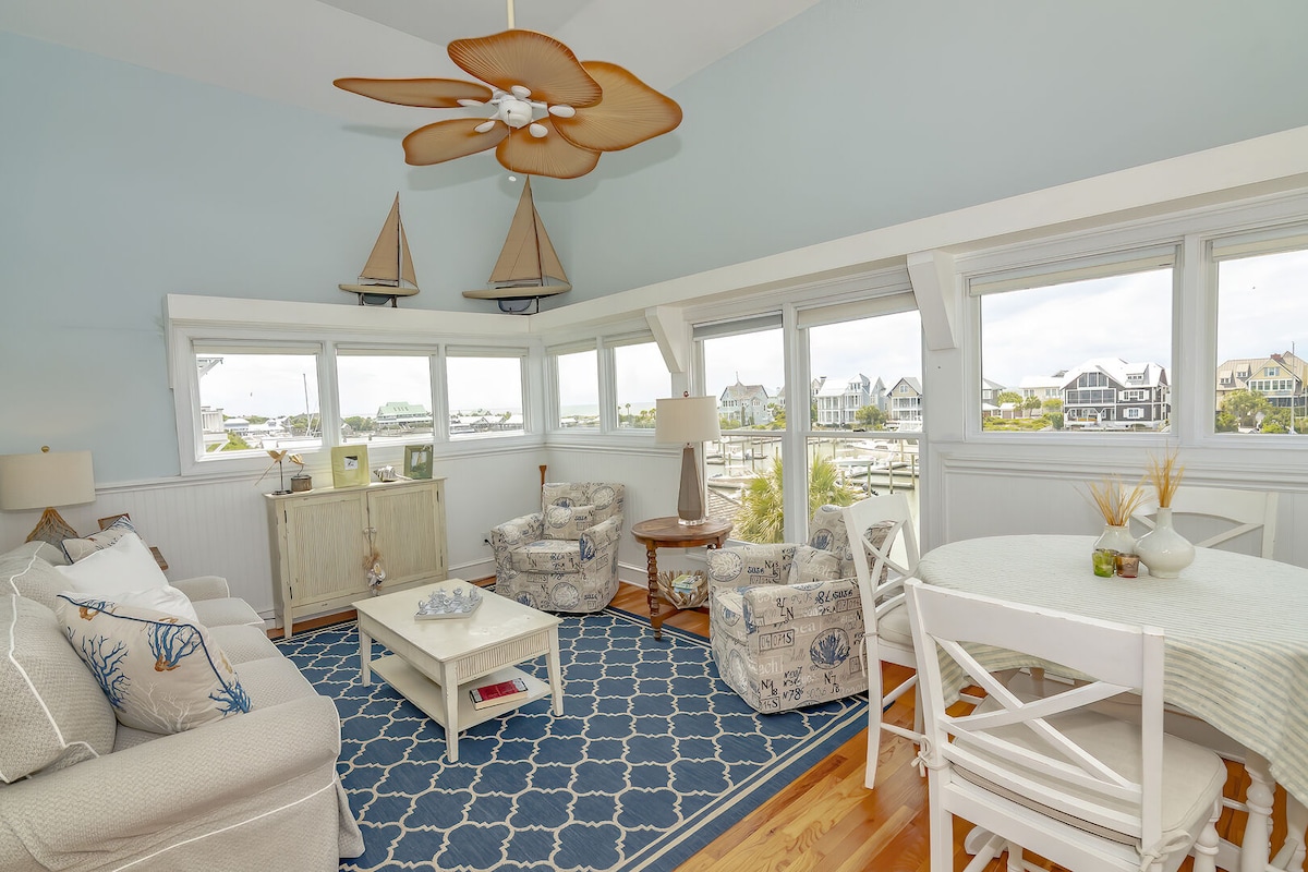 his beautifully appointed 3 rd floor suite with vaulted ceiling presents some of the best views on the Island with expansive windows in the living area showcasing glorious views of the Harbor, Cape Fear River, Ocean and Marsh. The coastal cottage design will have you on Island time in no time! You'll have plenty of space to spread out with a private Master Suite/Master Bath boasting views of the Harbour and fabulous views of the Marshes. Just off the living area, a spacious deck with new furnishings welcomes you to enjoy unparalleled 180% views. Left of the living area you'll find a charming 2-person Bunkbed room and another full bath. The living area and Kitchen areas have been newly remodeled and feature great new updates. A Queen Sleeper Sofa offers additional sleeping space for adventure weary sleepers. Enjoy the new counter height dining set for 4, bar seating for 2, a full refrigerator, built-in microwave, stove top, sink, stocked cabinets for your cooking enjoyment, and a new bar cart for extra storage and Keurig coffee service. This special suite boasts hardwood floors, beadboard throughout, fine linens, ceiling fans, and more. Enjoy the new wall mounted 50” TV complete with cable and high speed wi-fi for you streaming and browsing enjoyment at no additional cost. You will love this special suite and will look forward to returning after a day full of fun around the island. Restaurants, bars, Old Baldy and West Beach are a pleasant stroll away. A 4-person golf cart is included for your adventures during your stay with us.