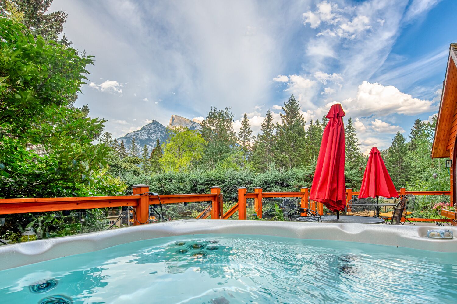Our spacious hot tub provides breathtaking views of Mount Rundle and is a perfect way to unwind after a day of skiing or hiking.