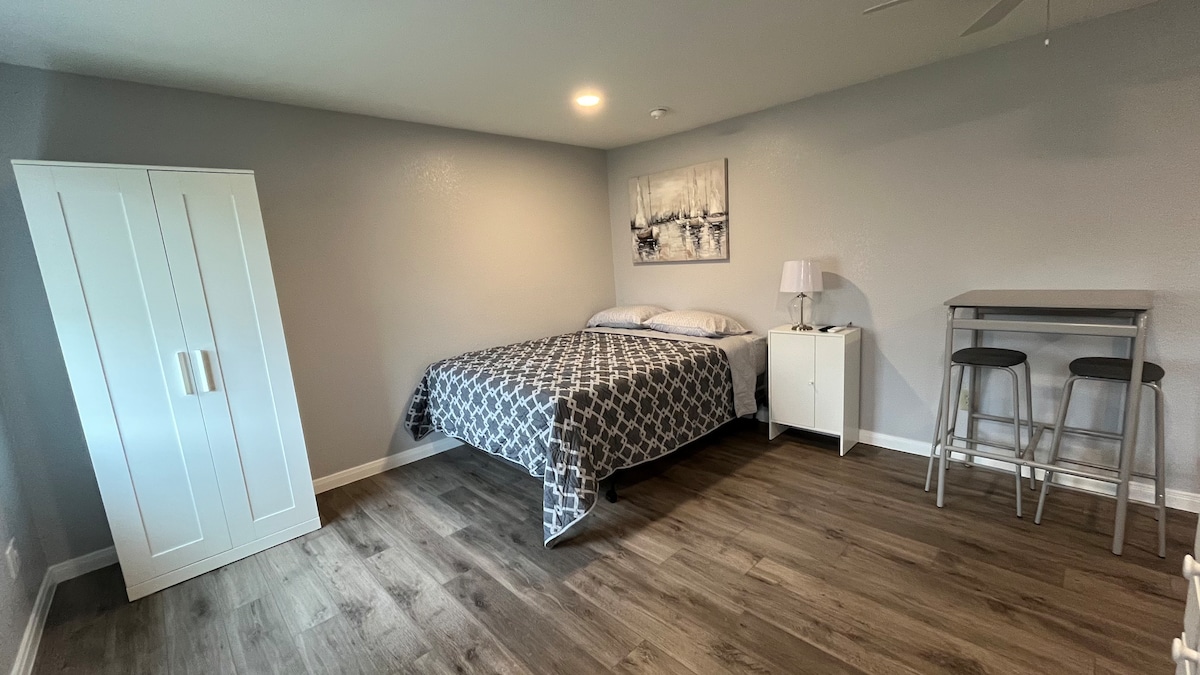 Fully furnished Studio Apartment with private entrance (above detached garage). Includes one queen sized bed and a full sized pop-up sofa bed. Fully equipped kitchen(Keurig, pans, cutlery and dishes) 42" Smart tv, (disney+,netflix, amazon prime, and hulu) with DVD and stereo sound.
