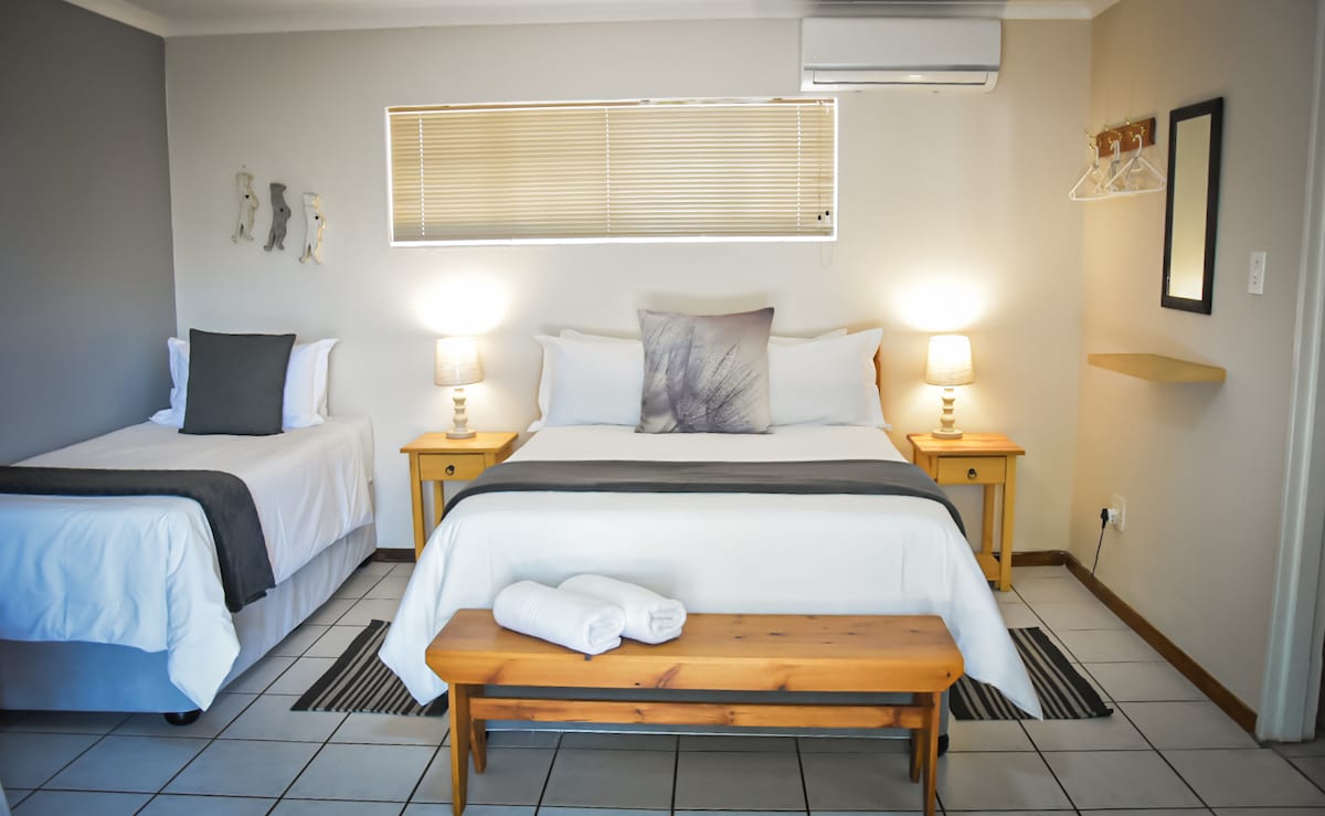 This room can accommodate 2 guests and has a queen-size bed and a private bathroom fitted with a walk-in shower. The room contains a ceiling fan, air-conditioning, a TV with DStv, free Wi-Fi access, coffee/tea, and heat-and-eat appliances.