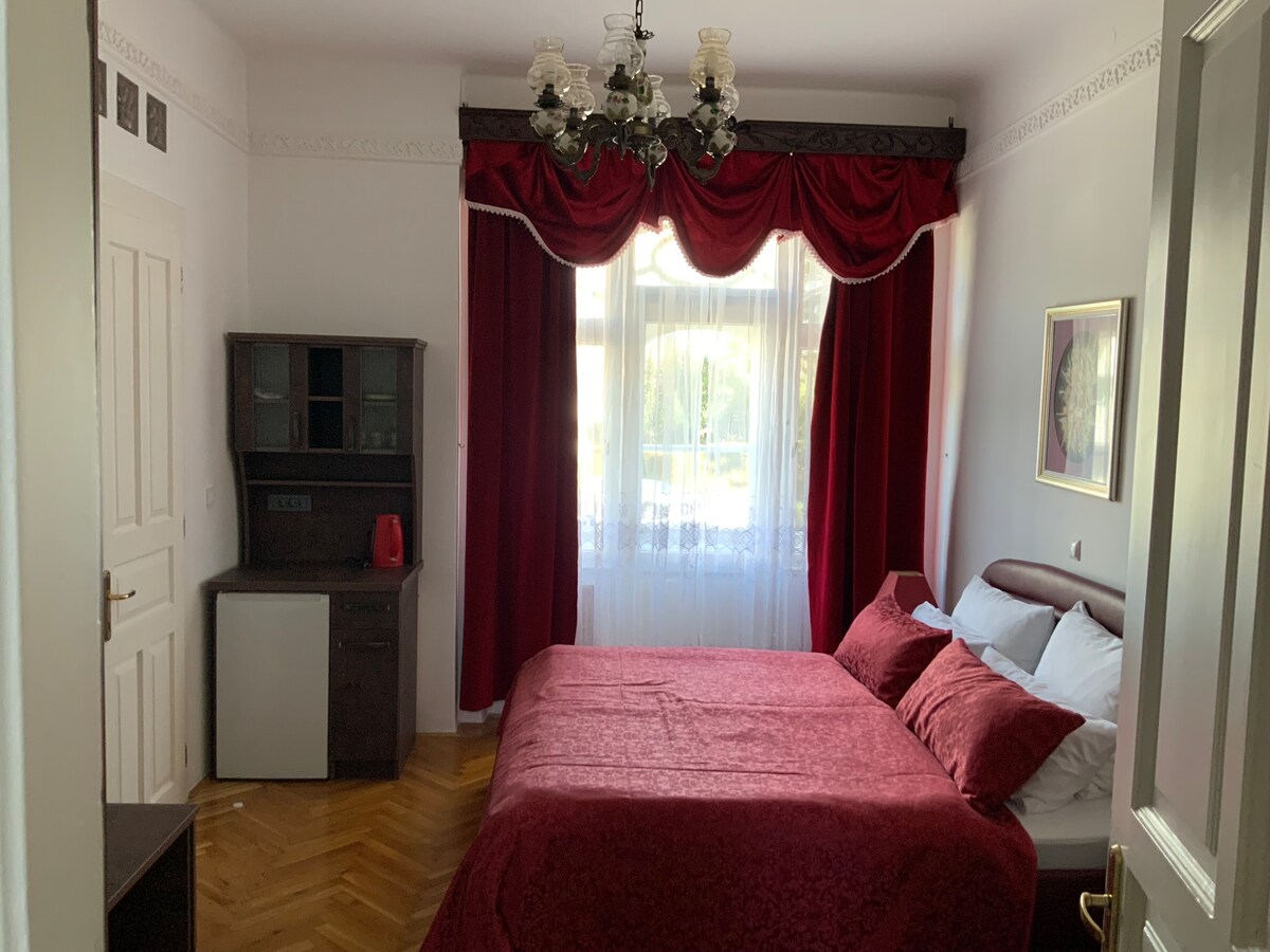 Step into the room - a charming space with soaring high ceilings and luxurious red velvet or citric curtains. Enjoy the comfort of your own private bathroom and a cozy dining niche, perfect for relaxing or enjoying a meal in privacy. A blend of elegance and comfort, this room offers a unique retreat in Vila Ana Generös.