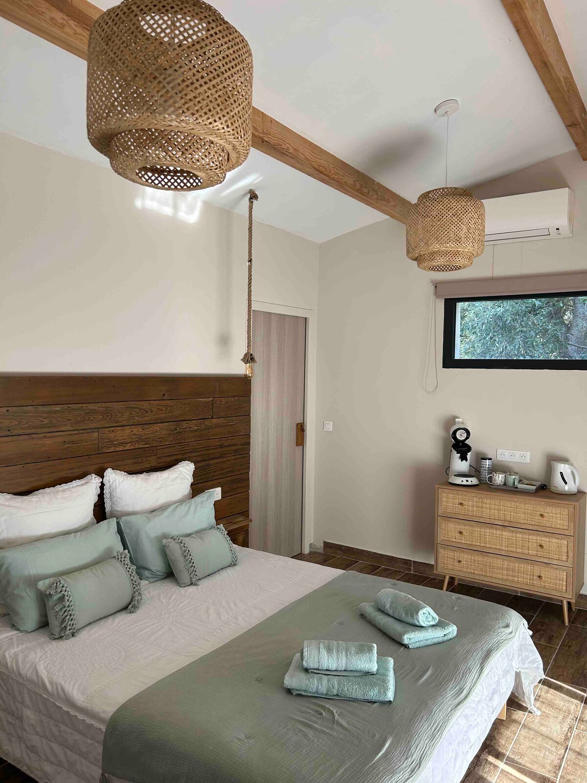 The cozy room is located in a quiet property of 22000 m2 , fenced by dry stone walls with parking available.