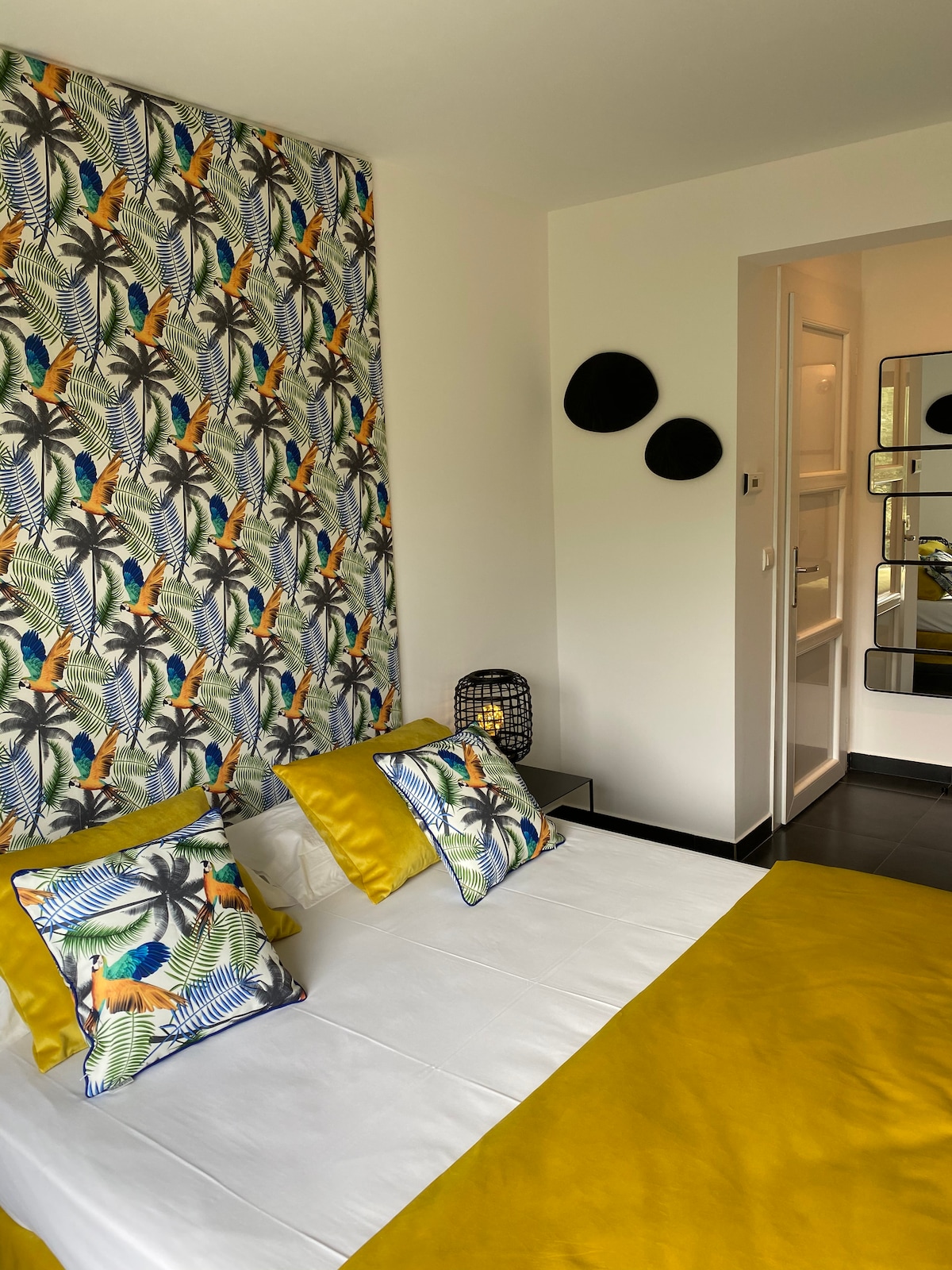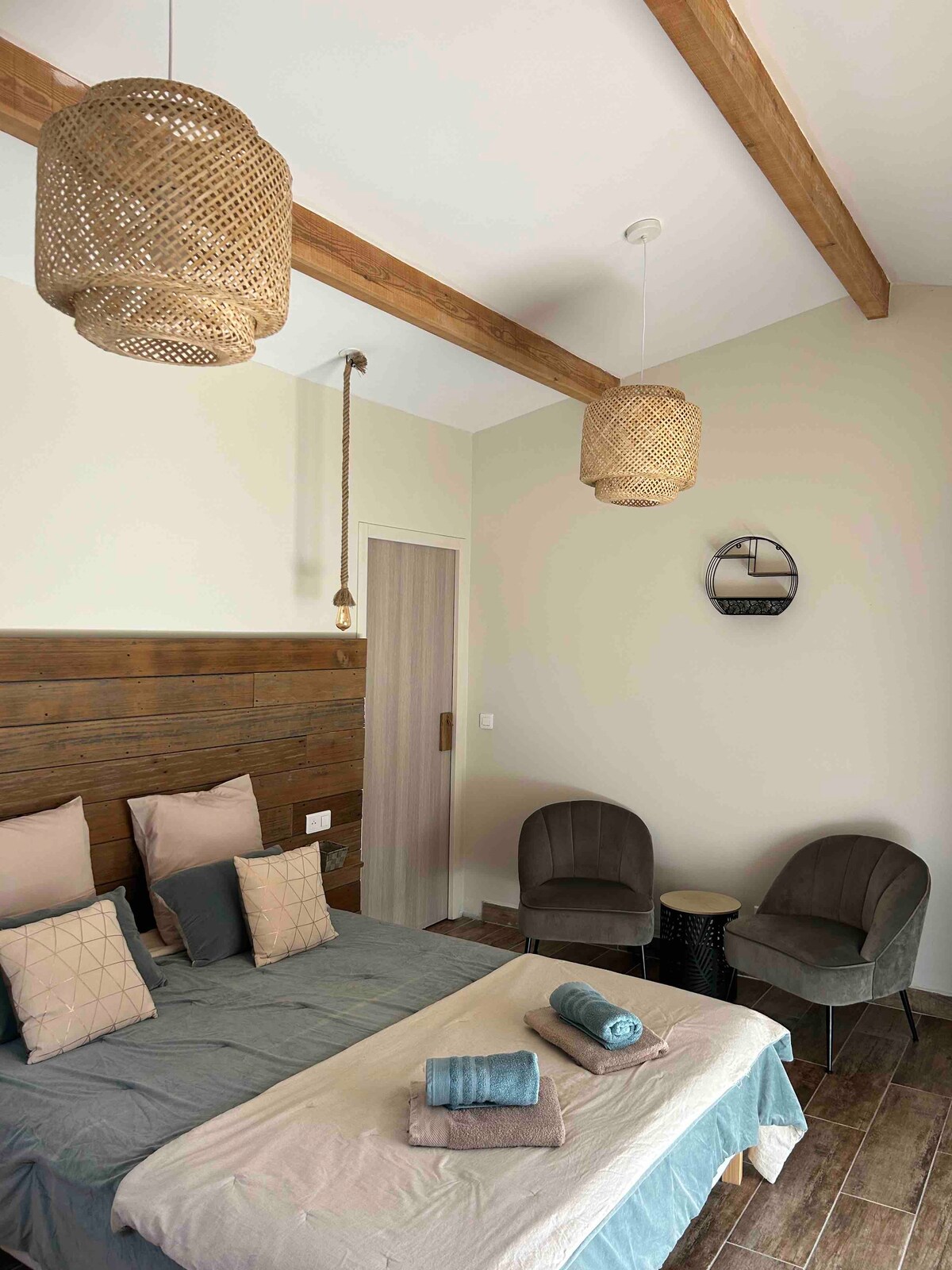 Discover this spacious room carefully decorated in a refined style and whose bed, enhanced by a golden headboard with solar motifs, brings a touch of elegance and warmth. The lounge area offers a perfect space to read or relax. The wall decoration and the materials used create a zen and harmonious atmosphere. The room bathed in light thanks to a large bay window, has all modern comforts. This room is a real invitation to serenity.