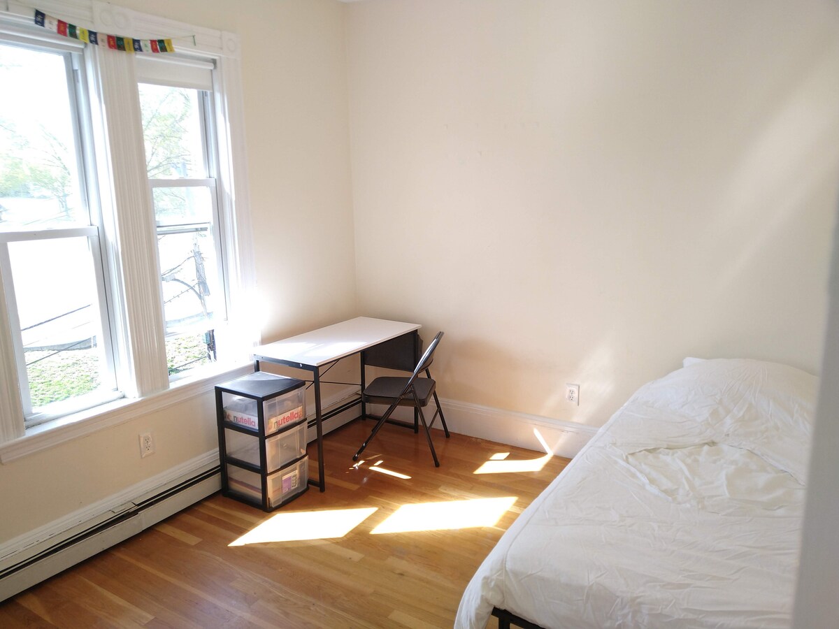 Private room & en-suite bath (private bathroom off bedroom). In single family house with shared yard on a quiet, tree-lined street. Excellent location - 5 min. walk to the subway (to downtown Boston, Harvard, MIT, etc.), grocery store, cafe, restaurants, etc. And 15 min. walk to Davis Sq. (more restaurants, movie theater, bars, shopping). 20 min. walk to Harvard Univ. Microwave, coffee maker and fridge in room. 1 minute walk to BlueBikes station. Fresh banana bread or the like upon arrival!