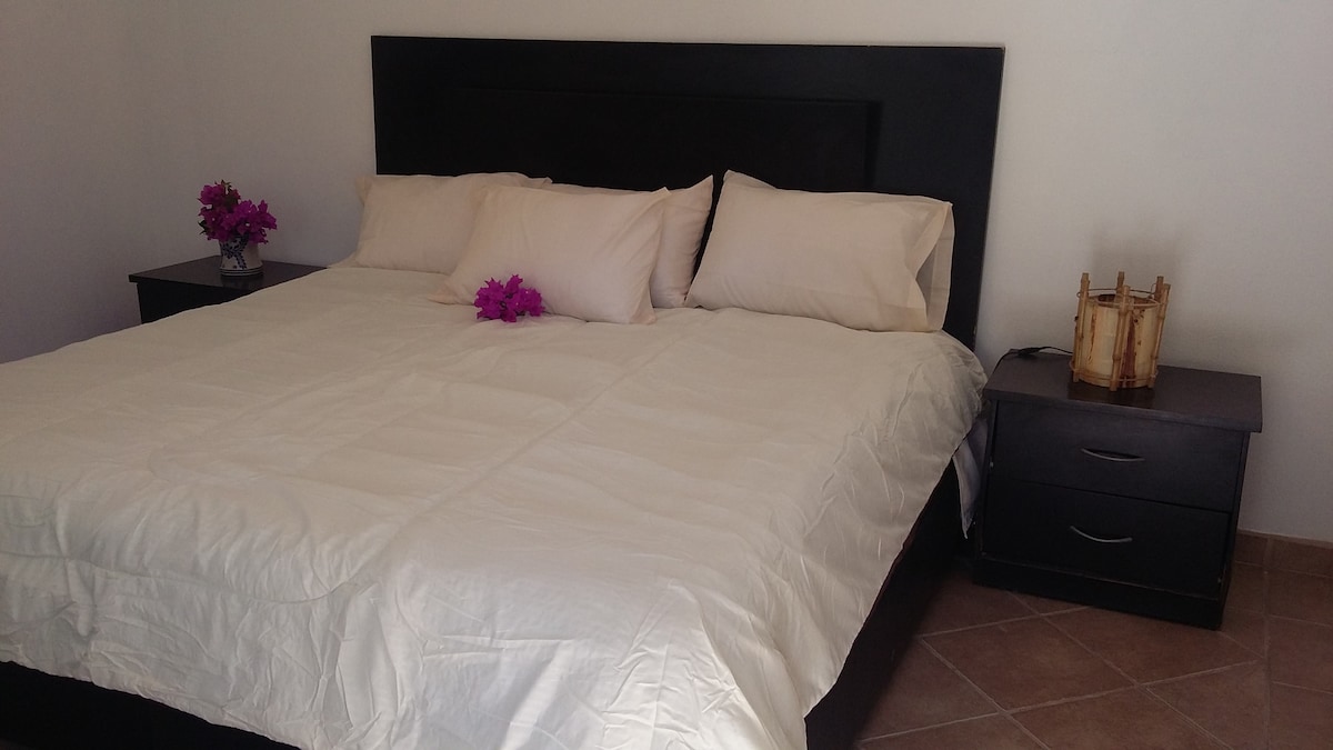 Private studio in downtown Cabo San Lucas. Located on the ground floor and independent from the main house. 1 bedroom with a king-size bed, 1 full bathroom, and a small kitchenette with microwave oven and fridge. Comfortable space for up to 2 people in a nice, quiet, family-friendly property with a shared pool, yard, and gas grill.