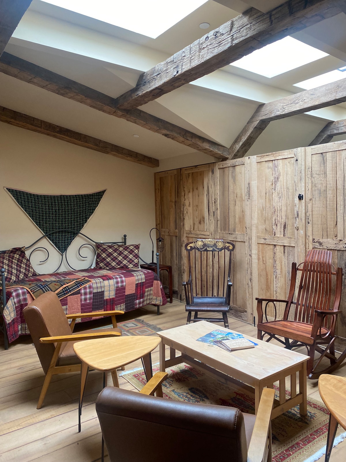 The Loft Suite has a small open area above the wall to the common area below. The room is the entire length of the top area of the Black Barn.