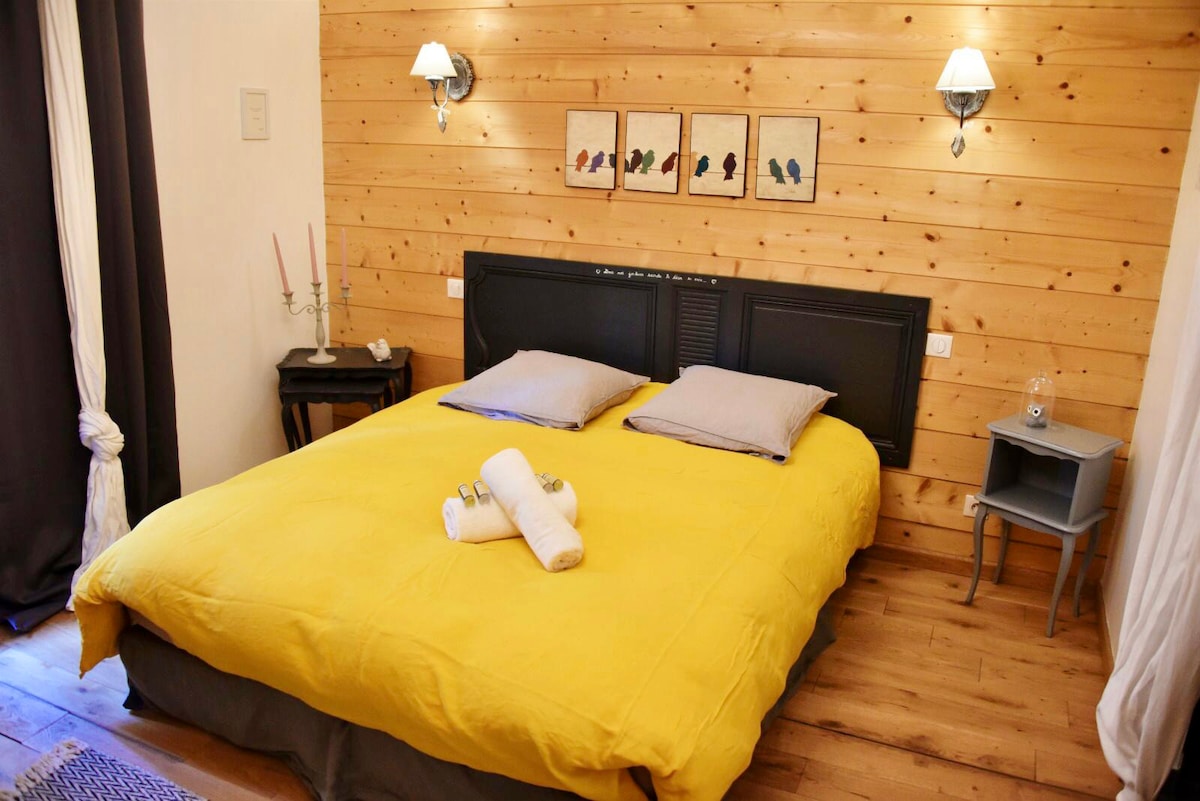 Bedroom with bathroom, private access to living room, kitchen and terrace. Wood-burning stove.