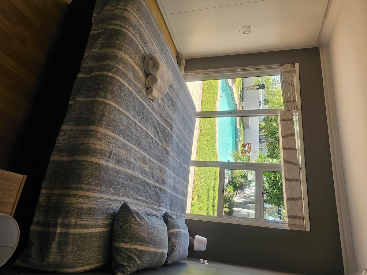 There is a lovely shower / sink / toilet. Bedside tables, a variety of books about Africa, and an electric hair dryer. A desk with 100 Mbps unlimited fibre internet. A selection of pamphlets listing things to do in Cape Town. Outside your door there is a fantastic pool which reaches up to 86 degrees F in Summer, with a hot outside shower. It is an extremely safe and secure place. Single women feel very safe here.