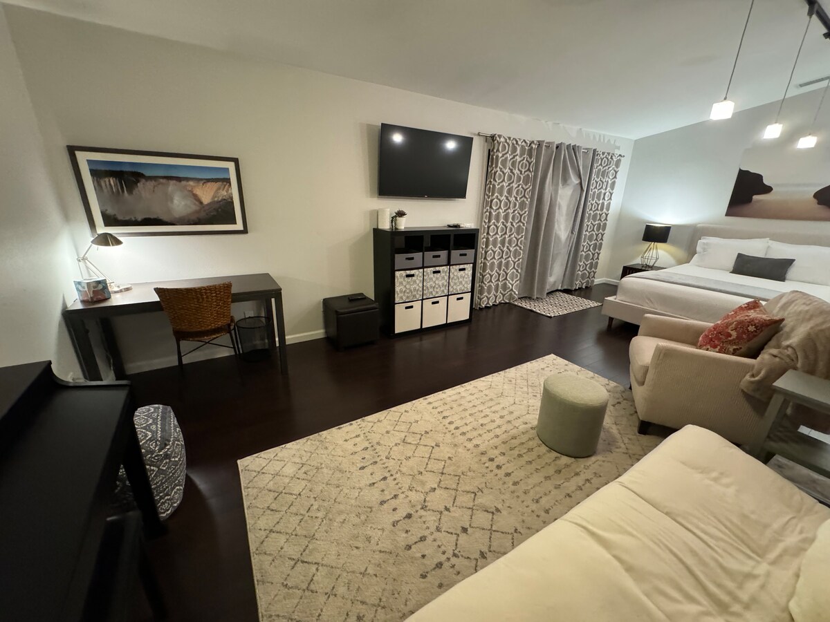 350 sqft casita with a queen bed, futon, desk, and 40inch tv. Full bath with a bathtub.
