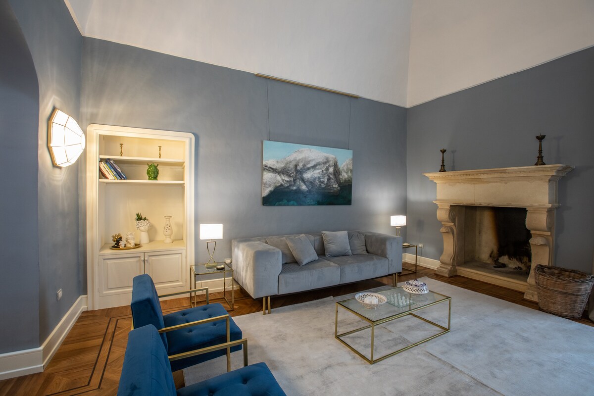 A cozy living room with vintage fireplace and a cool terrace from which to admire the historic center of Casarano is available to guests.