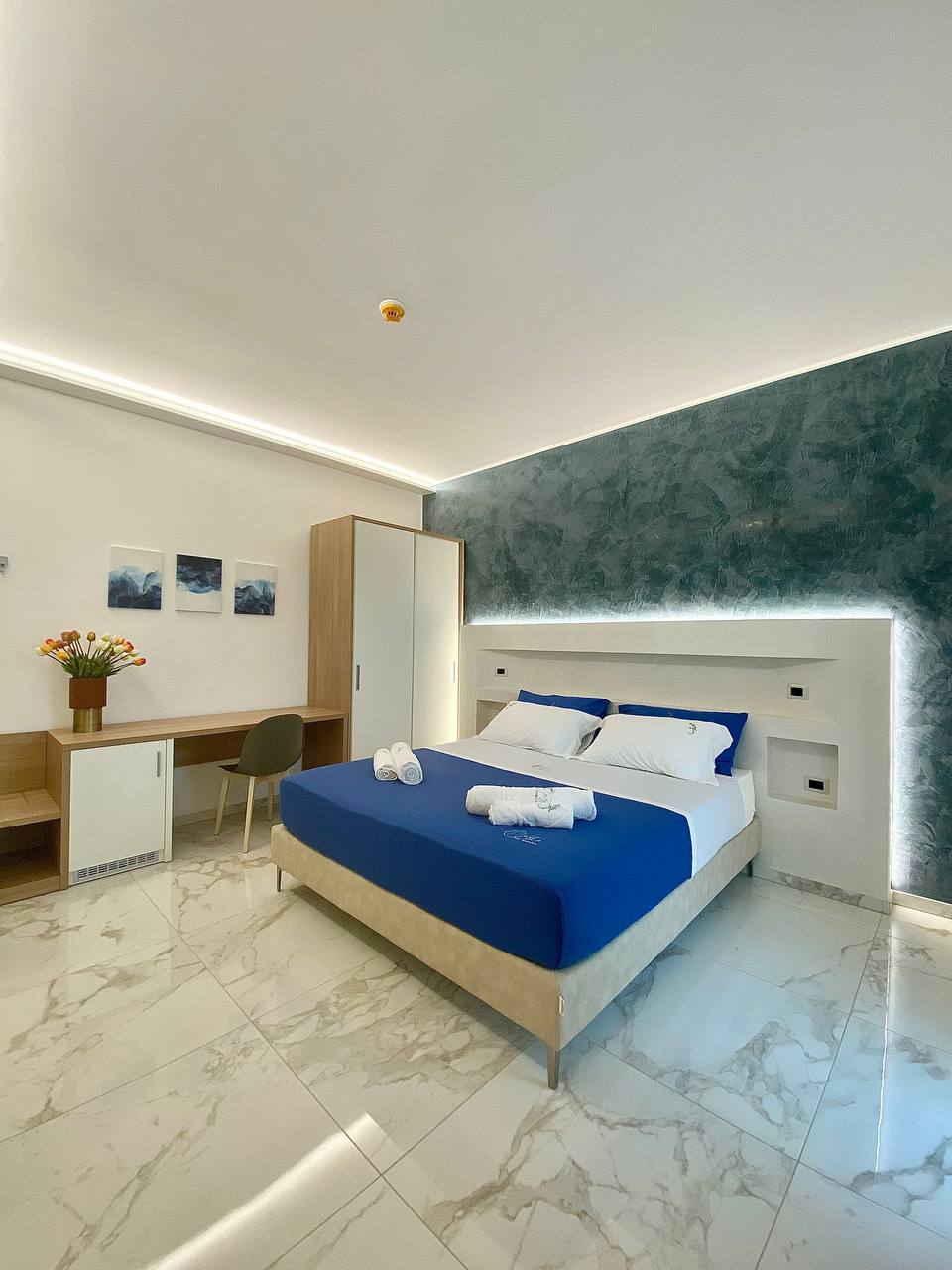 It borders the 16mt2 "Zaffiro" room made up of two single beds, desk, mirror, wardrobe and TV.