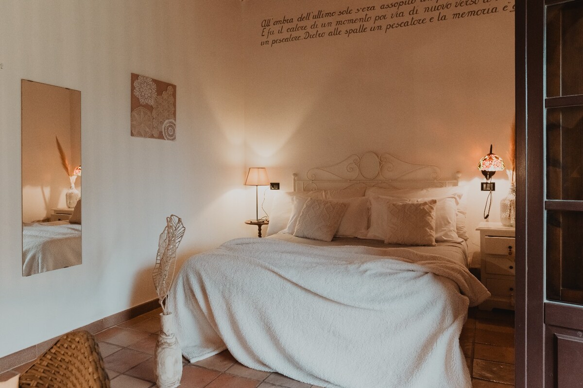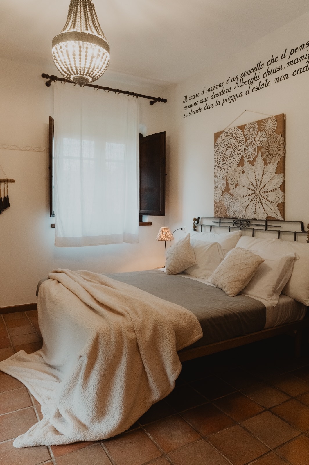 Cozy and comfortable double bedroom on the first floor of the farmhouse, with terracotta flooring, large bathroom with window, overlooking the vineyards.
