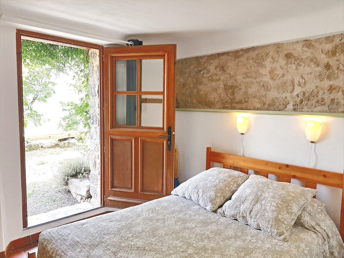This particular room of the old school was once the town hall of Chasteuil. Pascal left part of the original stone wall of the old school exposed when he transformed this room. Mediterranean Beach glass and marble tiles brighten up the bathroom, and through the farmhouse door, you can see the "Allée des tilleuls" and the Verdon Valley beyond. The stone room has a double bed and a single bed. Like all our rooms, it has a private bathroom with a shower, electric heating and an independent entrance. Shared: veranda with a kitchen, BBQ and terrace.