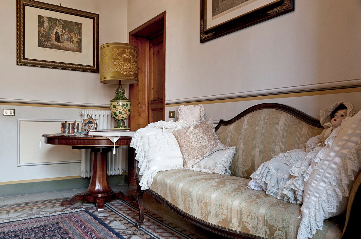 The B&B Liberty bedroom is located in the Manor House B&B at the first floor (no elevator), it is richly furnished, with fresco paintings in the ceiling, antique furnitures of Liberty age and with a well finished en-suite bathroom with an amazing round tub, tuscan travertino basin and floor. This historic 15th century building has been restored in 2010 conserving its original structure and design.