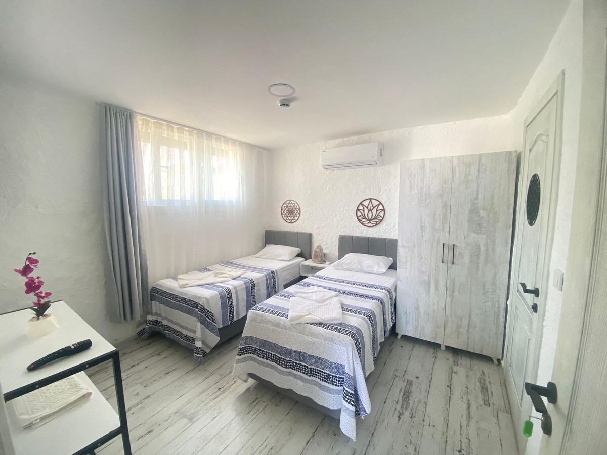 Our rooms have air conditioning, kitchen, TV, hot water and internet. Our prices are also included in our breakfast served in our spacious backyard. Our hotel is in the center of Cesme, 200mt to Çeşme Marina.