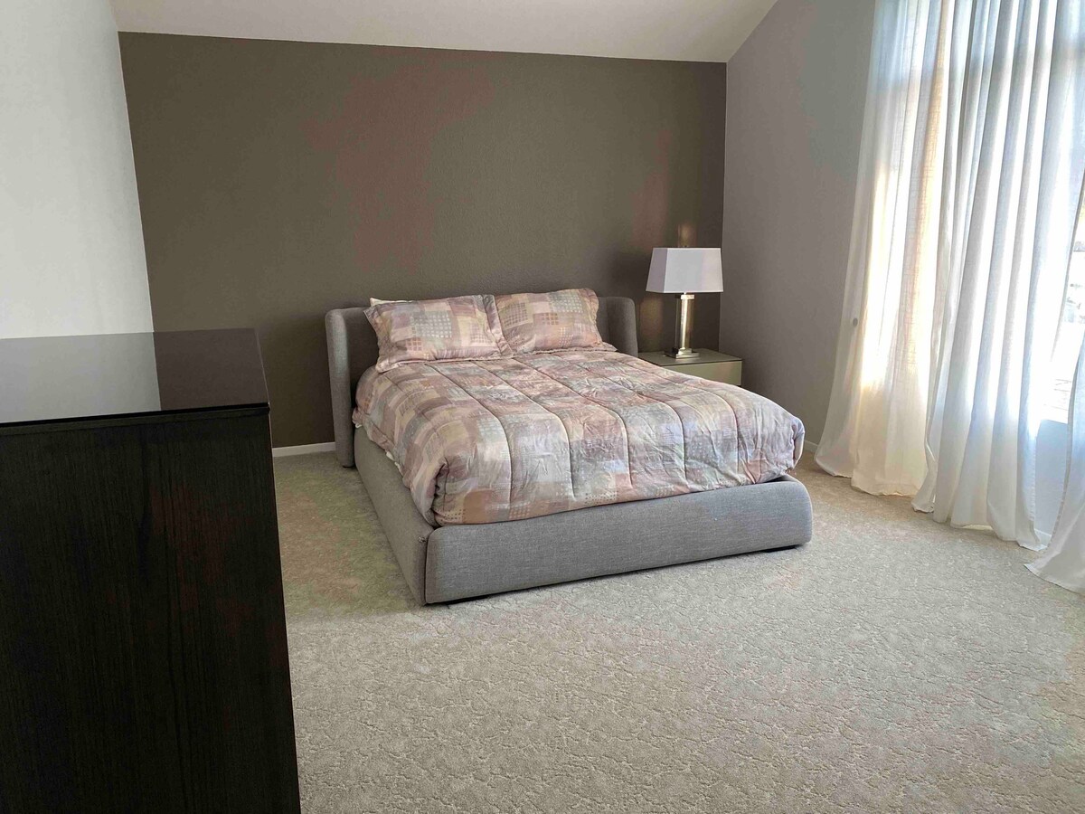 This place is located in a quiet neighborhood, bedroom has a queen bed, night table, walking closet, 50 inch TV, shower tub and basic amenities.