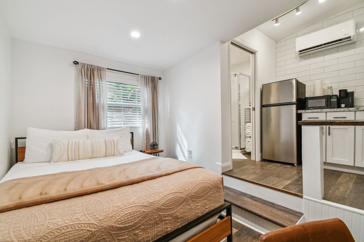 The studio is located on the front of our home with a separate entrance and keyless entry for Self check in. Parking is available in front of our home during your stay. The studio is 160 square feet and has a Kitchenette and bathroom. The kitchenette has a fridge, microwave, toaster & Keurig. The bathroom comes stocked with needed amenities like shampoo, conditioner and body wash. We also have a hairdryer, ironing board and iron available underneath the kitchen sink. The studio has a queen size bed always freshly made with white linens. The studio comes with a tdesk, smart TV, & private router for fast Wi-Fi. Netflix, Disney+ & regular channels are available.