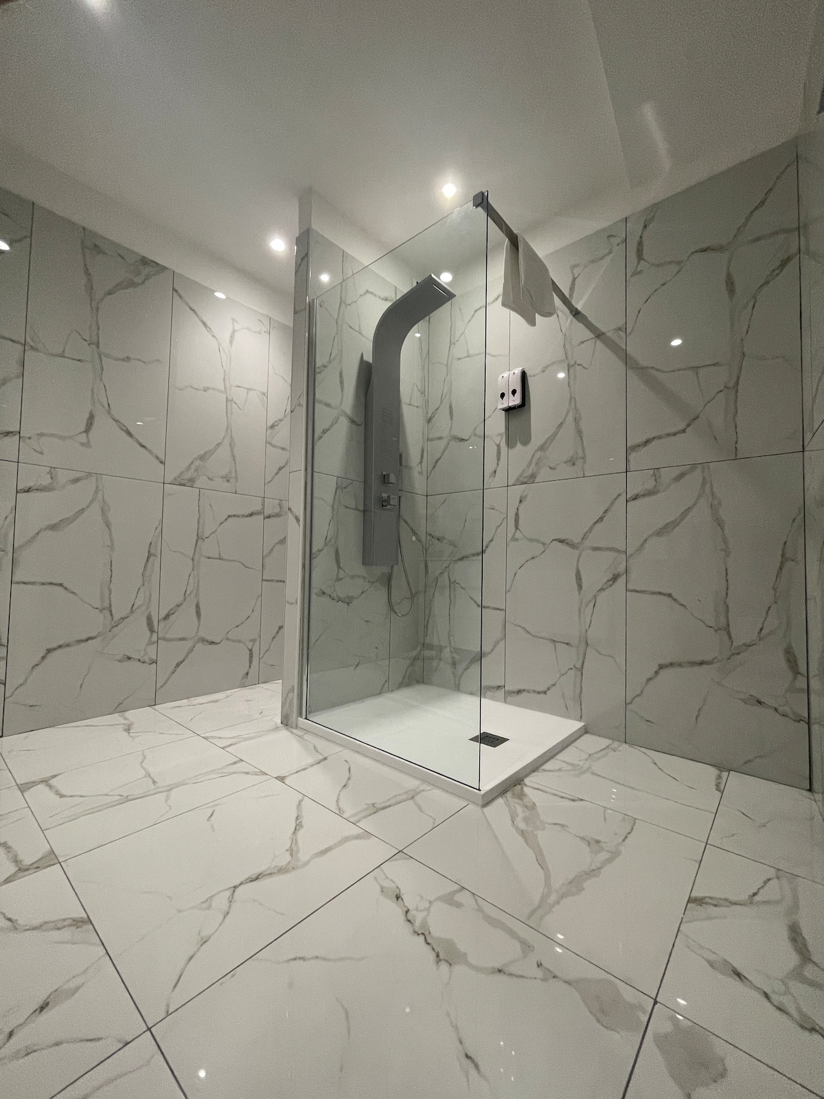 Comfortable room equipped with two-seater hot tub, private bathroom with large shower and double sink.