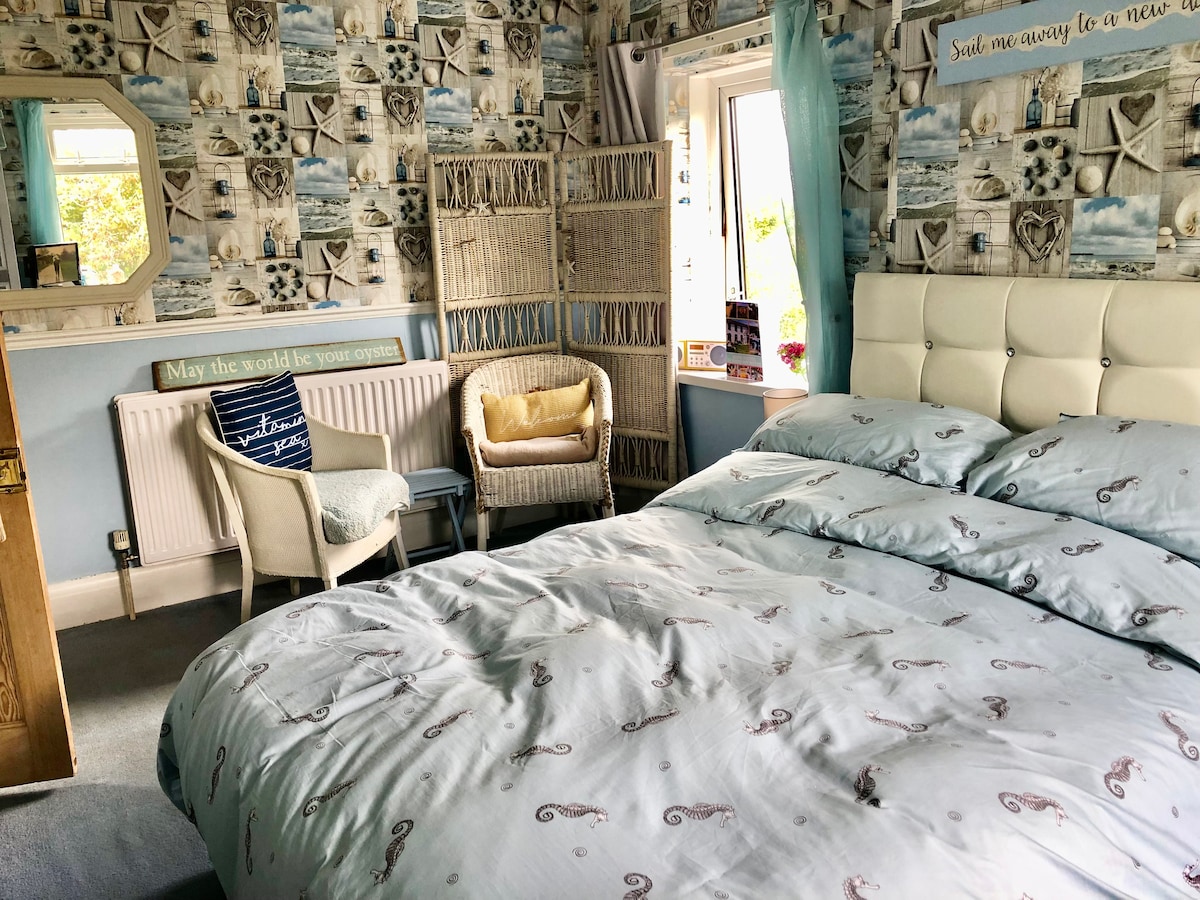 Our generously sized guest room with 1x DOUBLE BED (Airbnb system is showing incorrect bed situation) is light and airy with two windows overlooking fields. We provide all linen, towels and toiletries. There is a wardrobe and chest of drawers for your clothes. And a reclining armchair to relax in; plus two wicker arm chairs to enjoy a coffee in. Tea making facilities are in the room, including a Dulce Gusto coffee machine (pods provided). There is a 80cm/32” TV with remote; a radio. Your PRIVATE bathroom is a few feet away - bath with shower head and an electric shower over the bath. There is a discreet handrail over the Bath. Bath height is 21 inches/53 cms.