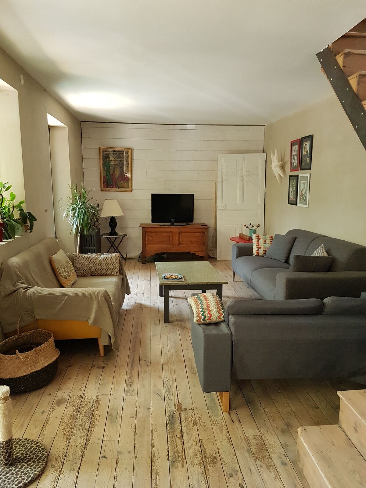 On the ground floor, an open room with equipped kitchen and a sitting area with a sofa bed. Upstairs, a central room equipped with a sofa bed giving access to the bathroom (and toilet) as well as a spacious bedroom with a double bed and a single bed.