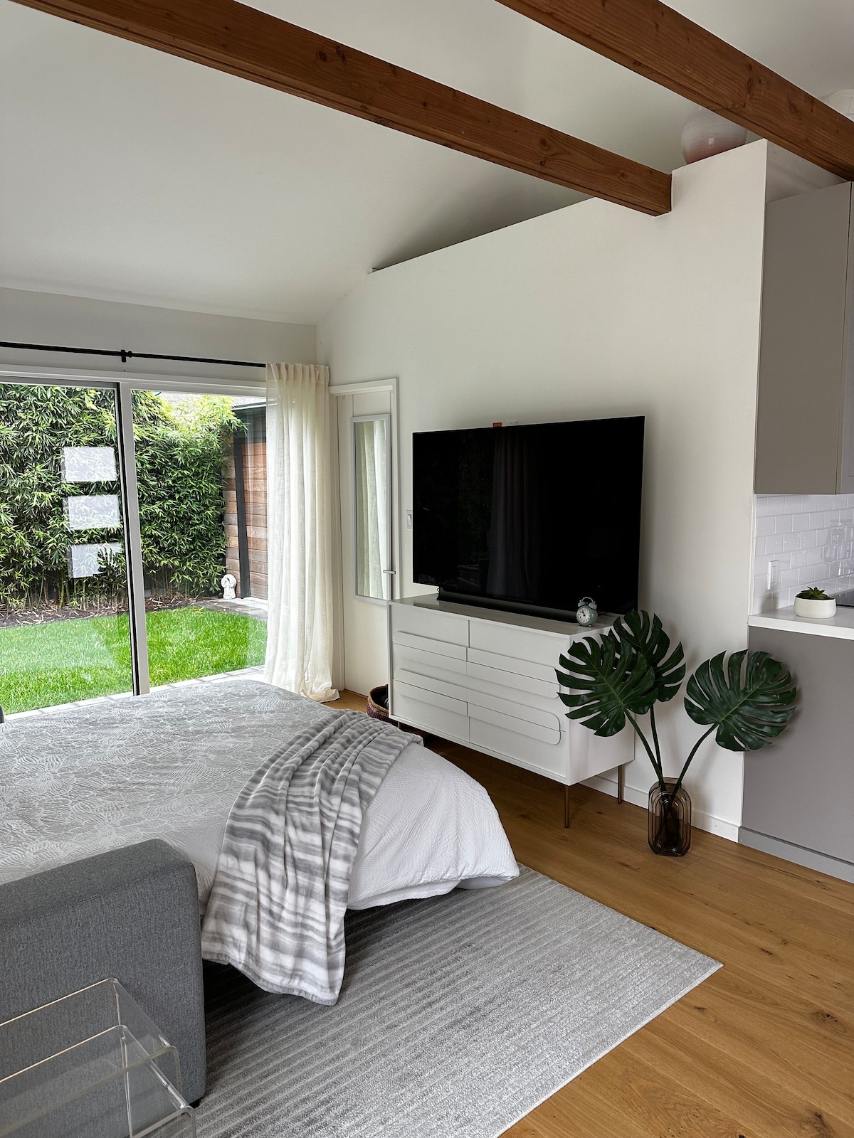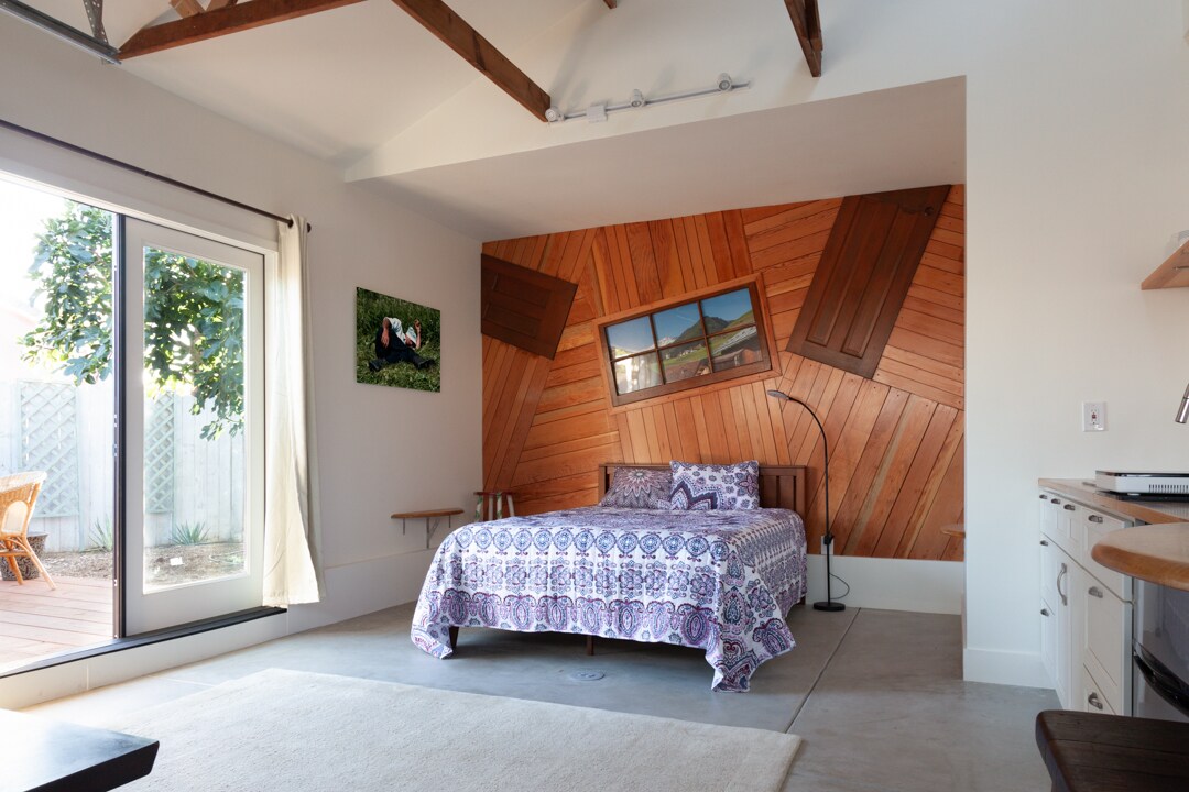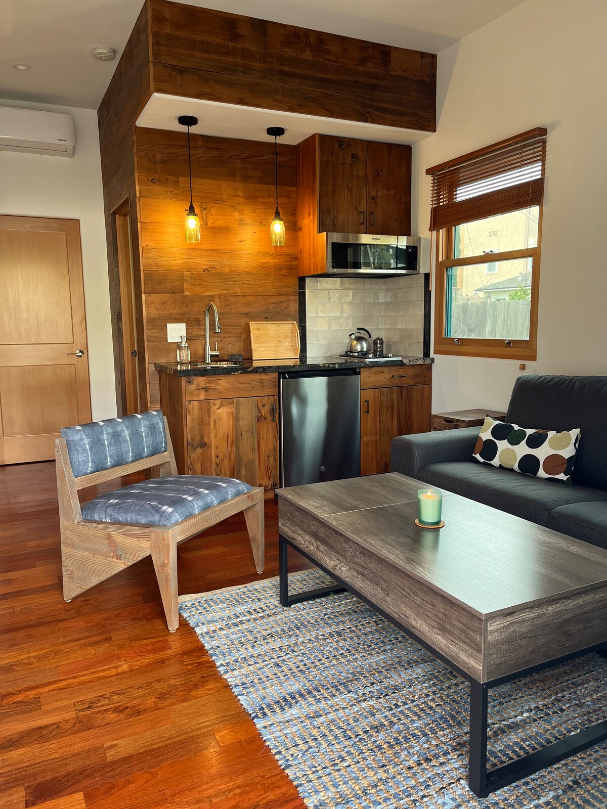 This charming and modern studio offers a full-sized bed with a twin trundle, a kitchenette, and a modern bathroom with a spacious shower. Large aluminum folding doors face an outdoor dining area while windows face a top-of-the-line Jacuzzi. Guests have full access to all spaces in this cozy, one-bedroom ADU, designed for your comfort and enjoyment in this quiet and safe neighborhood in Culver City, CA.