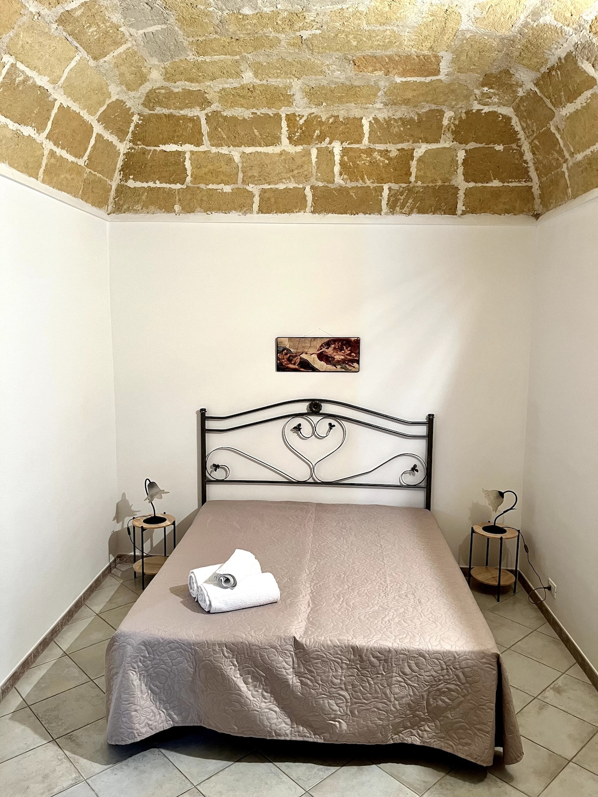 The Dionisio room has a double bed and a bathroom in the room. Well ventilated with several openings, it is a characteristic environment of the Sicilian tradition, it is a typical Sicilian house of the 800 Furnished in detail with vintage objects because the intent is to revive to the guest the places and emotions of the past. However, the room is equipped with many comforts: air conditioning, TV, internet, bathroom set, sheets, personal hygiene products, which make the stay pleasant and practical . The room is on the ground floor, adjacent to the kitchen-living room where you can make abundant and tasty breakfasts and by reservation, enjoy typical Sicilian dishes and learn to cook our traditional dishes (CUS CUS, fried and broth boxes, cookies .....)