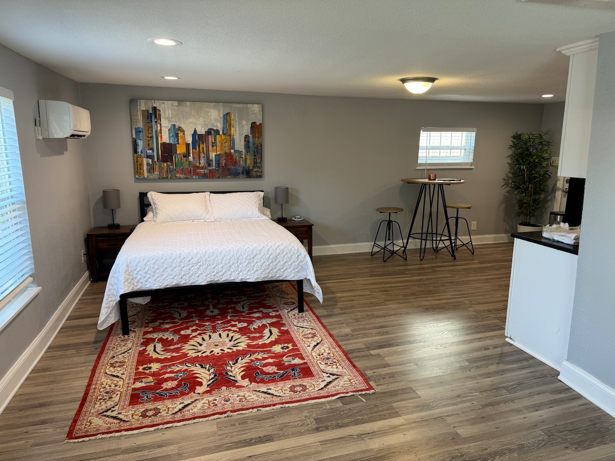 Enjoy comfort and privacy in this stylish 500 sq. ft. guest house. Relax in a plush queen bed, stream on a 42-inch TV, and cook in a full kitchen. A dedicated workspace and high-speed Wi-Fi make remote work easy. Private driveway and entrance ensure convenience. Located in a safe neighborhood near attractions, dining, and shopping. Perfect for business or leisure. Book now for a seamless stay!