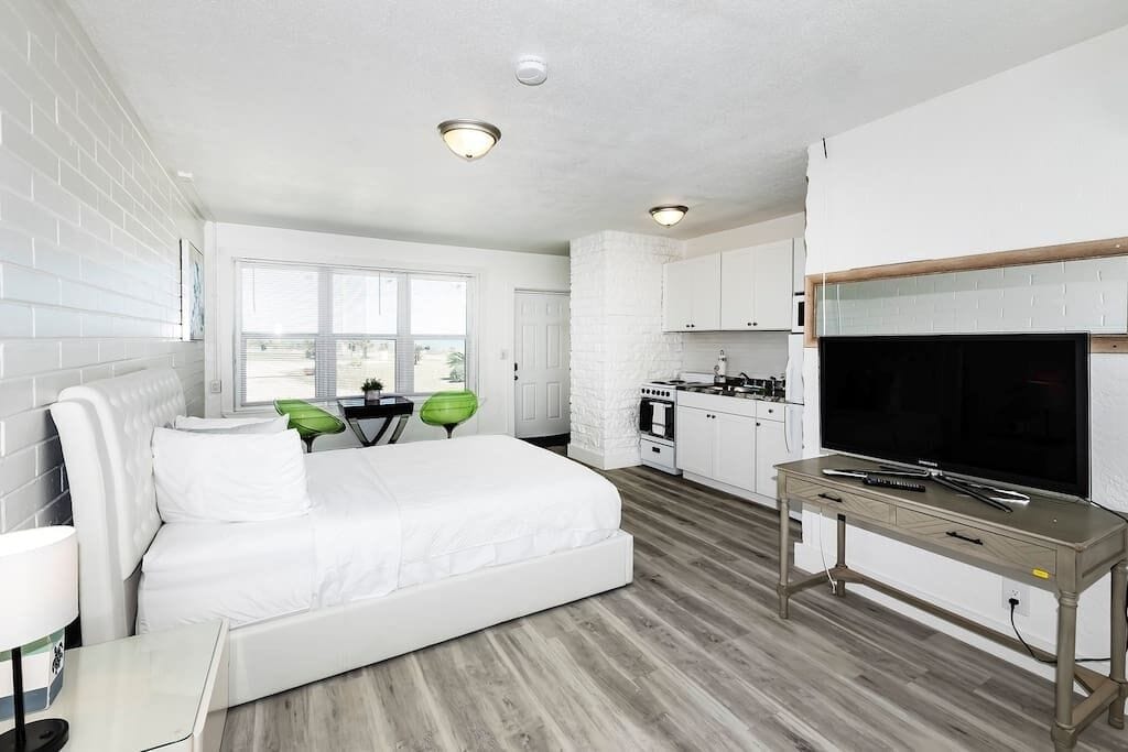 You’ll love the stylish decor of this charming place to stay. You will be close to everything at The Pineapple Shores Motel. The unit was recently fully renovated and includes an adorable kitchenette, 2 queen beds and a small futon that could sleep a child. Motel is located in Daytona Shores across from the beach and comes fully stocked. Enjoy quintessential Florida at this retro inn that is a throw back to the 50`s when Daytona Beach hit the scene. Non-aggressive dogs allowed with pet fee.