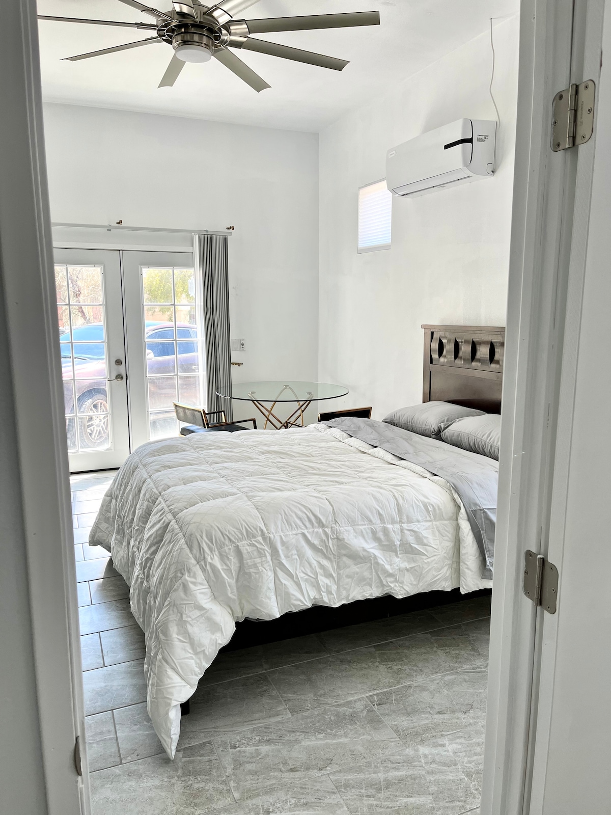 The bedroom has a small refrigerator, a microwave oven, a toaster, a Keurig style coffeemaker, and a one burner induction cooktop. There are enough utensils to make an omelet and toast. Although it has a small table with chairs where you can enjoy your breakfast inside, you will want to go out to the yard and enjoy the gorgeous view of the Coachella Valley, Mount San Jacinto and the swimming pool. The air-conditioning system in the room, is a split system. You can control the temperature, and make it as you cool or as warm as you like.