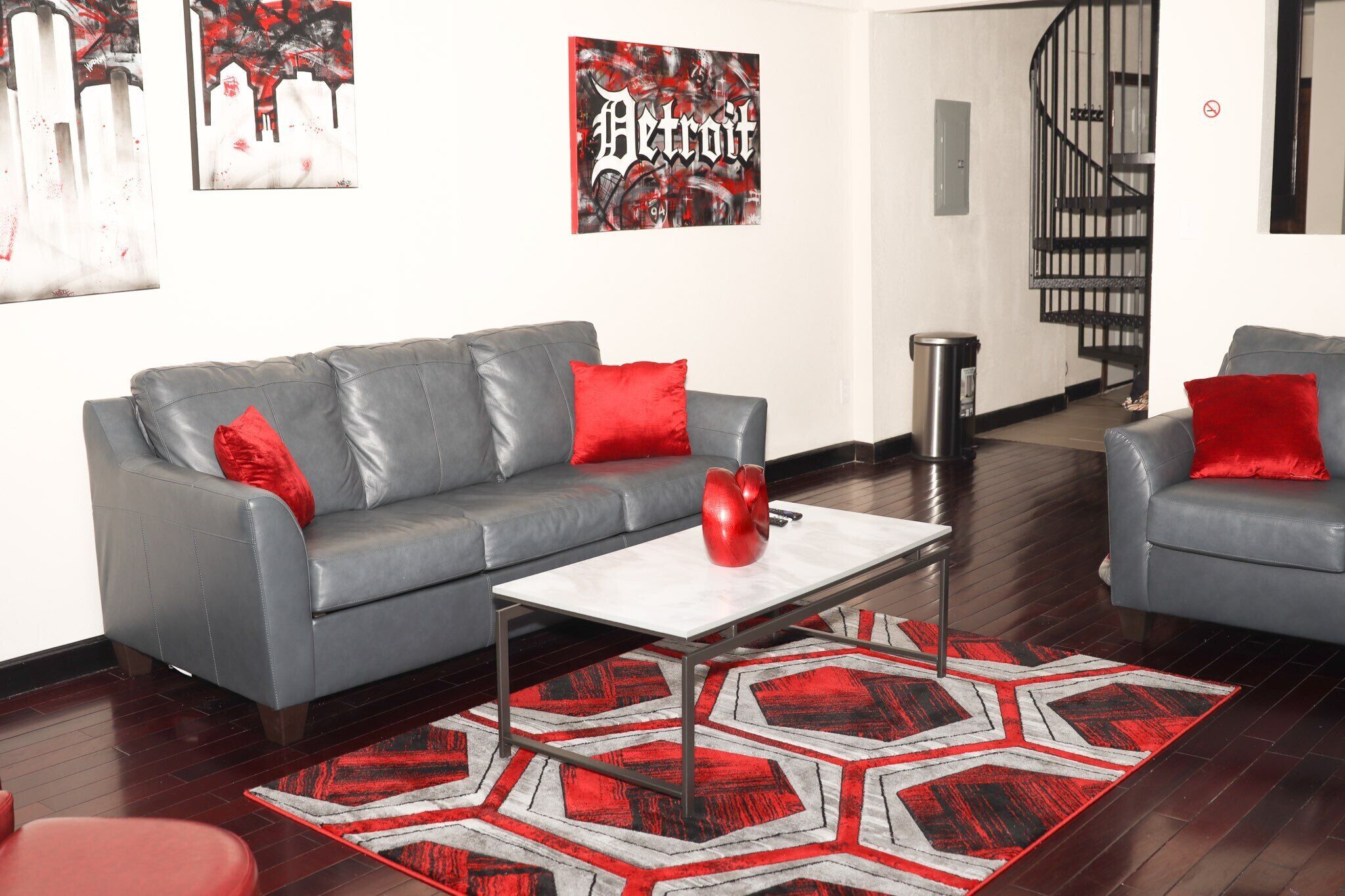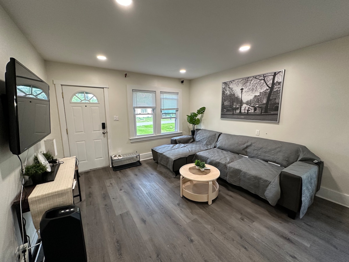 Beautiful Loft style Airbnb fit to sleep four people. It features cherry hard wood floors, 1 bedroom, 1.5 bathrooms with jetted tub in the full bathroom, Living room with Sofa Couch, 70 inch tv', Spiral staircase, Lovely kitchen area with stainless steel appliances, granite countertops, washer/dryer, with gated parking just minutes from Downtown Detroit, across from the Detroit River