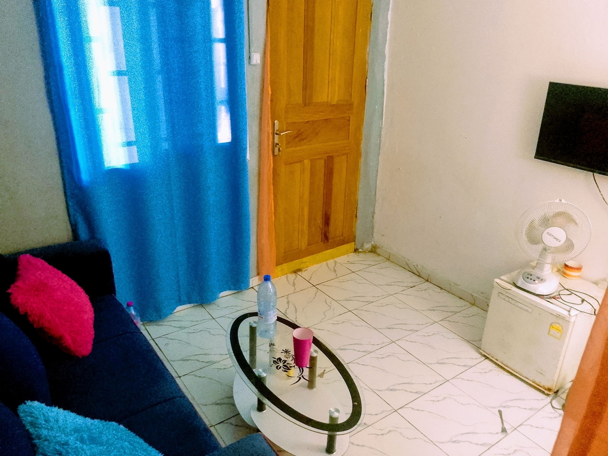 Quiet and friendly space offering good value. This room is on the first floor of a fenced-in building. The listing is less than a minute's walk from the main road. Many Shops, Restaurants, and Supermarkets are in the vicinity. The location is perfect for all your trips in the city of Douala.