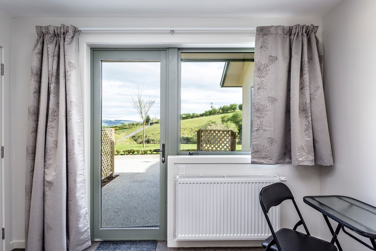 Our ensuite bedroom has a shower hand basin and toilet. Lovely views, a table and fridge, there is also a modern shared equipped kitchen available.
