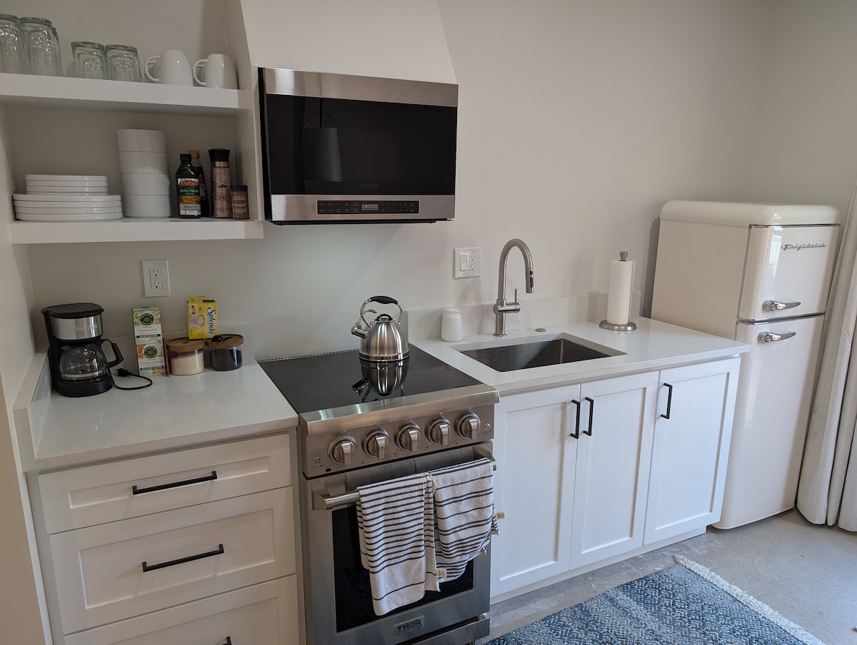 The Casita is a completely refurbished 200 sq ft tiny house with bedroom/living room area, work desk, dining area, kitchen, and bathroom with shower. It is tiny, but super cute, comfortable & private. Kitchen is fully equipped +complimentary coffee & tea