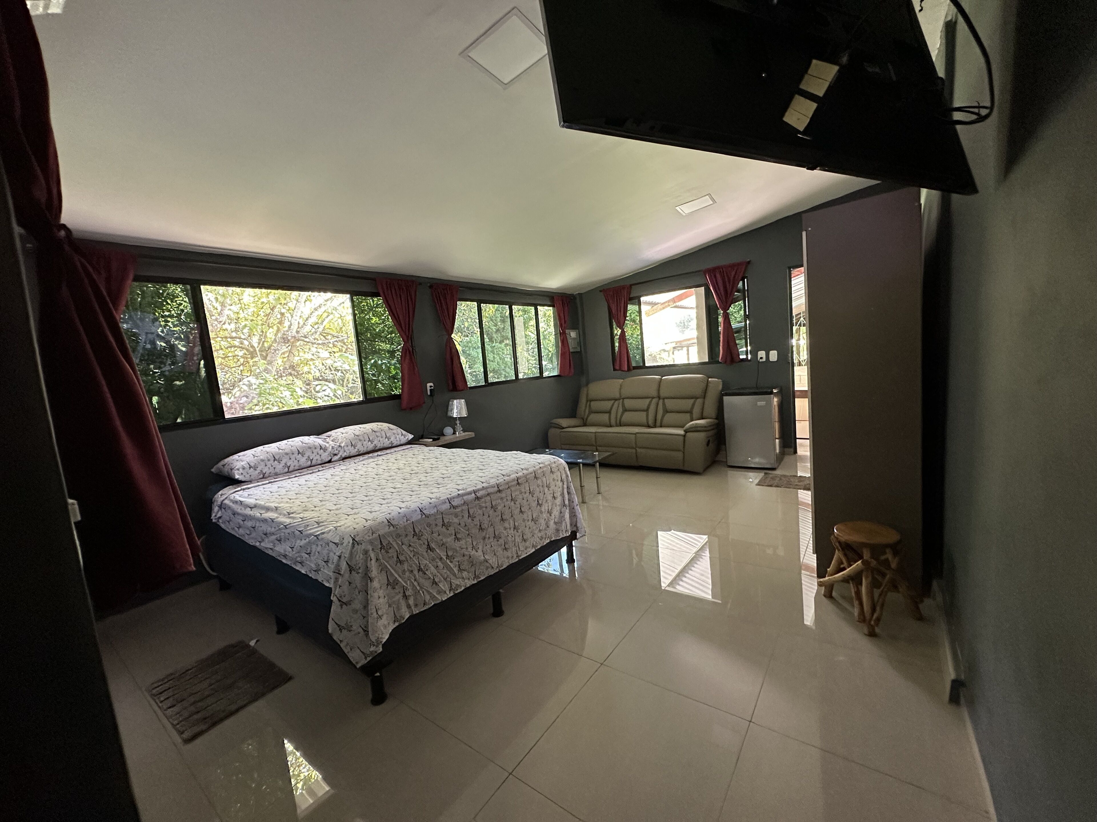 Private loft style apartment with open spaces, with a room that has a closet for storage, 50”TV, desk with an ergonomic chair and a comfortable king size bed for your full rest.
