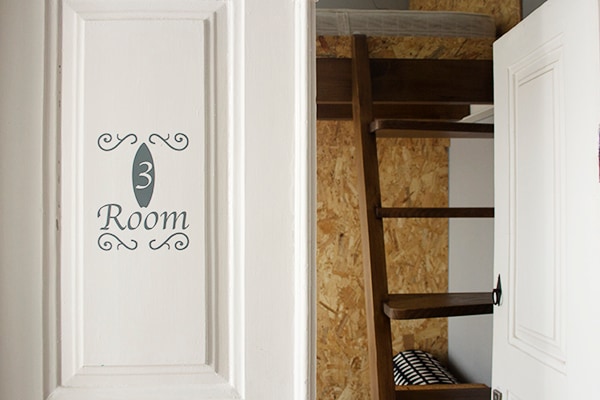Our mixed dorm room takes advantage of its high ceilings with his triple custom-made bunk beds.