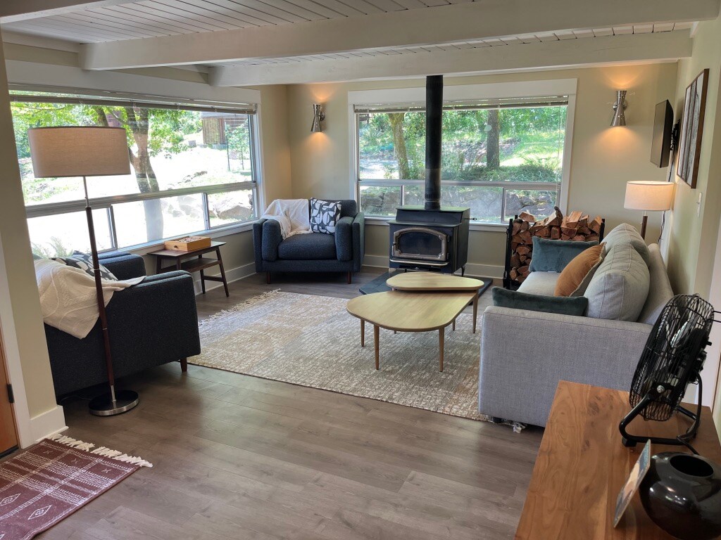 The 1,400 square foot upstairs apartment features a bedroom with a king size bed, bathroom, eating nook, great room with large sectional and kitchenette.