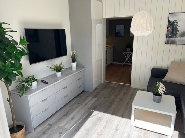 Washing machine with dryer in one. Underfloor heating in bathrooms. TV with TV Box (Apple TV) with SvTPlay and eg. Netflix if you have your own account - but not analog TV (antenna). Wifi included. Completely renovated which gives a fresh feeling.