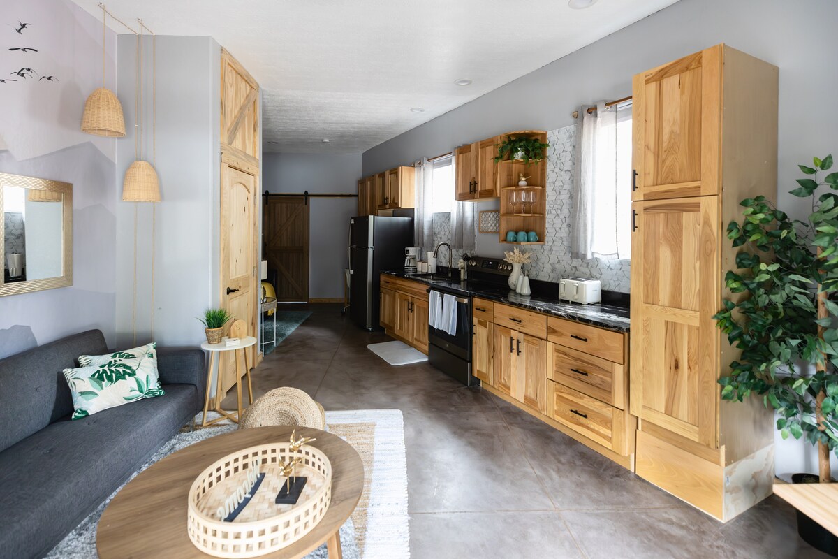 Our 1 bedroom 1 bathroom casita is a charming and chic guesthouse with its own private entrance. Note there is some minimal noise transfer from the main house. At ~500sq ft. our casita is spacious enough to include an en-suite bathroom, kitchen with full size appliances, full size washer and dryer, spacious dining area, closet and workspace, mini-split air-conditioning for max comfort.