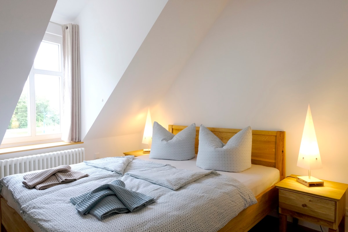 The interior decoration in contrast of white and wood creates that Scandinavian coziness that immediately radiates a pleasant warmth. In both apartments you sleep in a spacious double bed and use your own modern bathroom. Wi-Fi and satellite TV are of course also available free of charge.