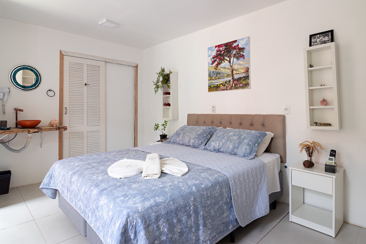 By Lagoa da Conceição, our studio is the go-to for nature-loving couples. Just cross the street to reach the lagoon. Close to restaurants, cafes, and bars, it comes with a full kitchen, double bed, AC, Smart TV, and Wi-Fi. We've got you covered with bedding, towels, kitchen gear, hairdryer, and soap.