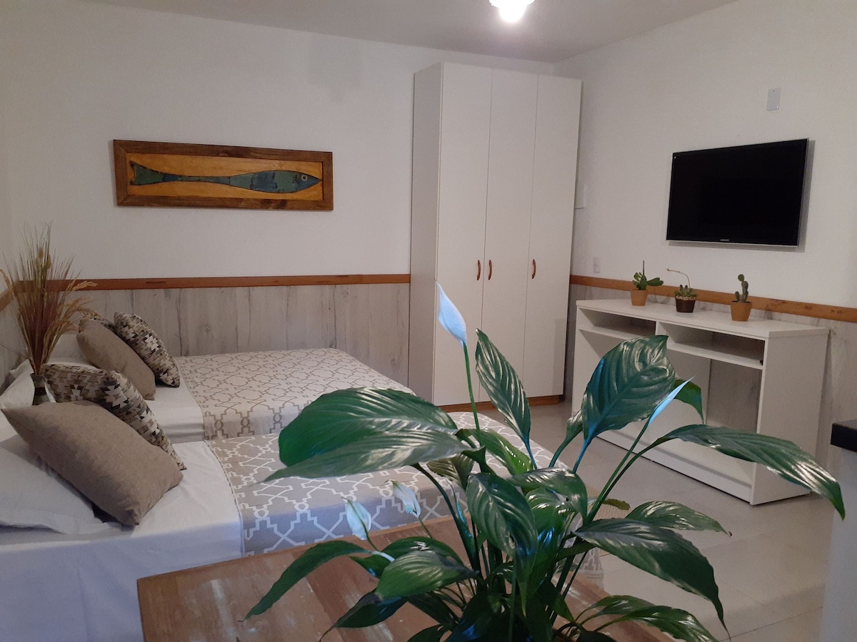 Ideal environment for single or couple, with the possibility of mattress in the lounge. The apartments have full kitchens planned for their convenience. Pousada located near BR 101 in a strategic location for those who want to know the island of Florianópolis, the preserved beaches of Governador Celso Ramos and Guarda do Embaú. Distance from the Beaches: Palmas do arvoredo (beach with blue flag) 40km/45min. Guarda Do Embaú 46 km/45 minutes. Praia do Campeche 21km/50min. Downtown Florianópolis 11 km/20min. We have a garden in the outdoor area of the inn, porcelain flooring, ceiling fan, stone sink countertop. In addition, we have a wifi network. The bathroom covered in porcelain tile (with wooden design), glass box and stone countertop. The guesthouse has a laundry room for collective use, with outdoor space for a clothesline. The apartments are mostly on the ground floor. The bed and breakfast has an employee who resides on site, she will be ready to assist you. The bed and breakfast is close to the public square, markets, pharmacy and mall. However, the covered parking is not on the premises of the inn, but across the street.