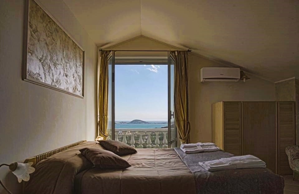 Guests of our B&B will have a private room of about 65 sqm divided into a living room with panoramic view of the Gulf of Gaeta, an internal bedroom with a French double bed and French window with sea view, directly connected with another double bedroom, also equipped with a French window with access to the external panoramic balcony equipped with sofas and a table where you can comfortably relax enjoying the view, perhaps with a family dinner or a sunrise breakfast with friends. Each room mentioned is air-conditioned. There is a private bathroom. The room is equipped with: mini fridge, coffee maker and kettle for herbal teas/tea, microwave, lunch plates and cutlery, courtesy kit and every useful comfort for a pleasant stay.