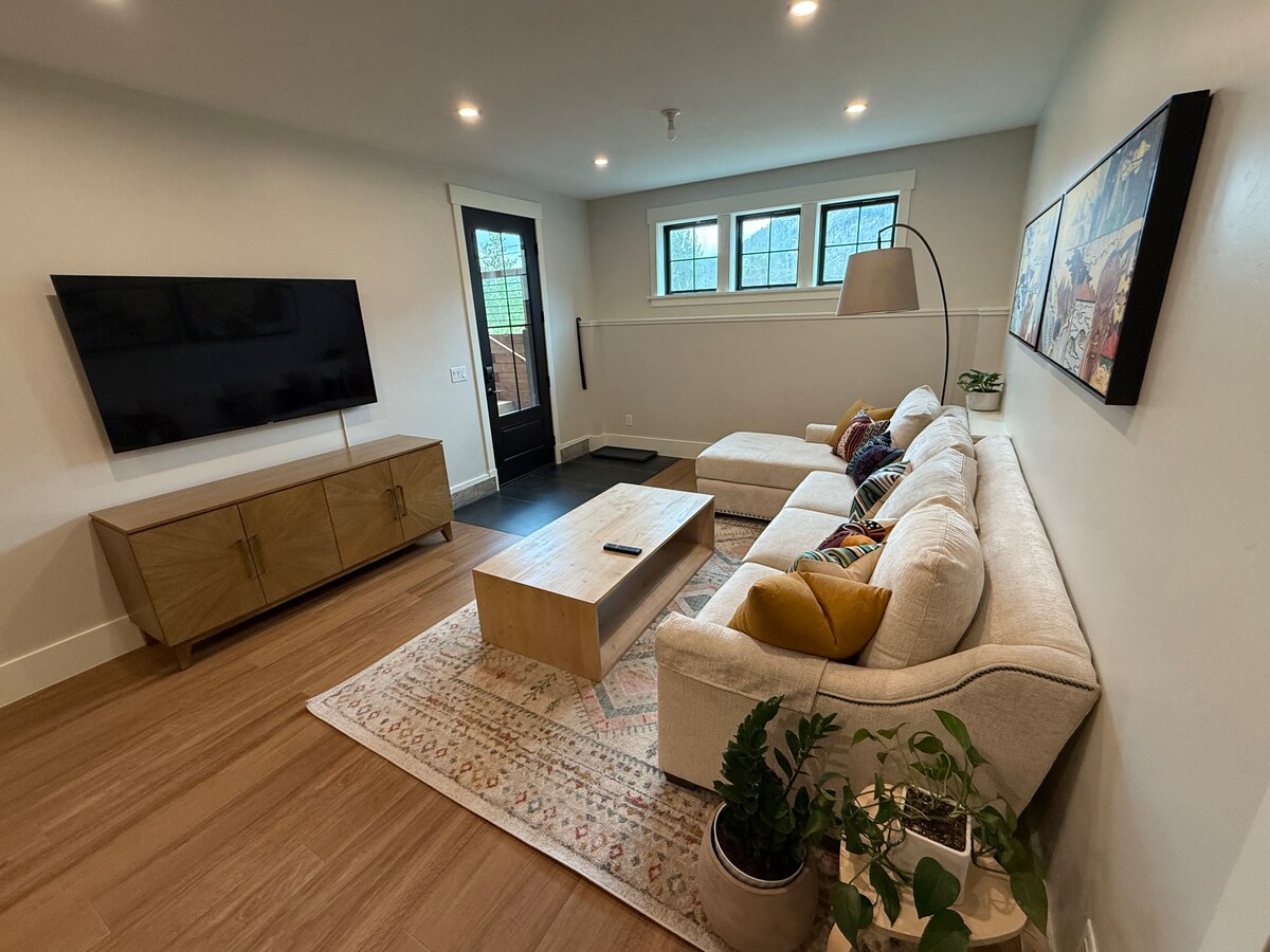 Enter through your private entrance and step into a spacious living room, complete with a sectional couch and large TV—perfect for unwinding after a day of adventure.