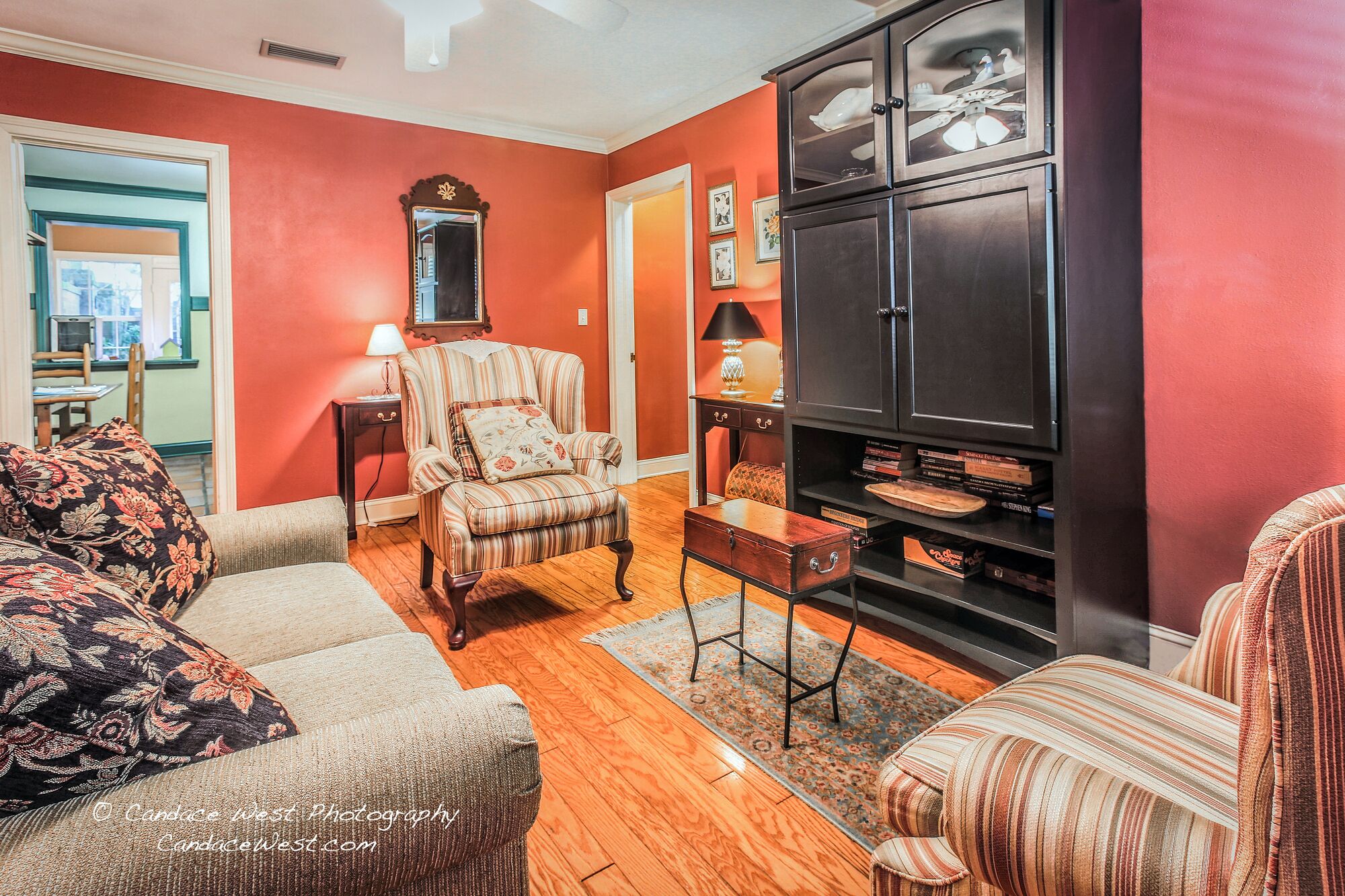 The Lady Clare room at the historic Camellia Rose Inn is comfortably furnished with a beautiful king bed, couch, and a beautiful armoire. The Camellia Rose Inn has beautiful, large porch areas and inside sitting areas. Walk to downtown Gainesville restaurants, bars, parks and more! Quiet and peaceful neighborhood.