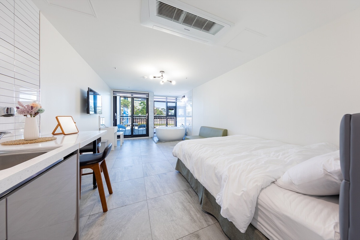 A cozy room with a modern and tidy white tone, located 3 minutes to Gyeongpo Beach, and it is a place where you can see the clean sea of Gangneung, which is cool in the yard of Gangneung. We want you to feel the relaxation of your heart as you see the verdant sea.