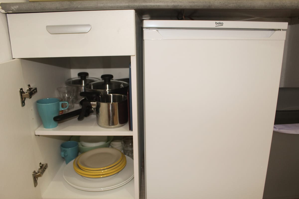 The place sleeps 2 adults or 2 adults and 1 child. The bedroom is off the kitchen, and has a wardrobe and a double bed. To the right of the kitchen is the living room, with a couch bed, and a tv with internet. We provide a baby bed if needed. Off the living room is the bathroom, with a shower.